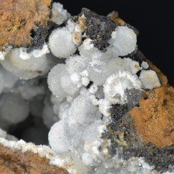 White to transparent hemimorphite spheres on stabilised...
