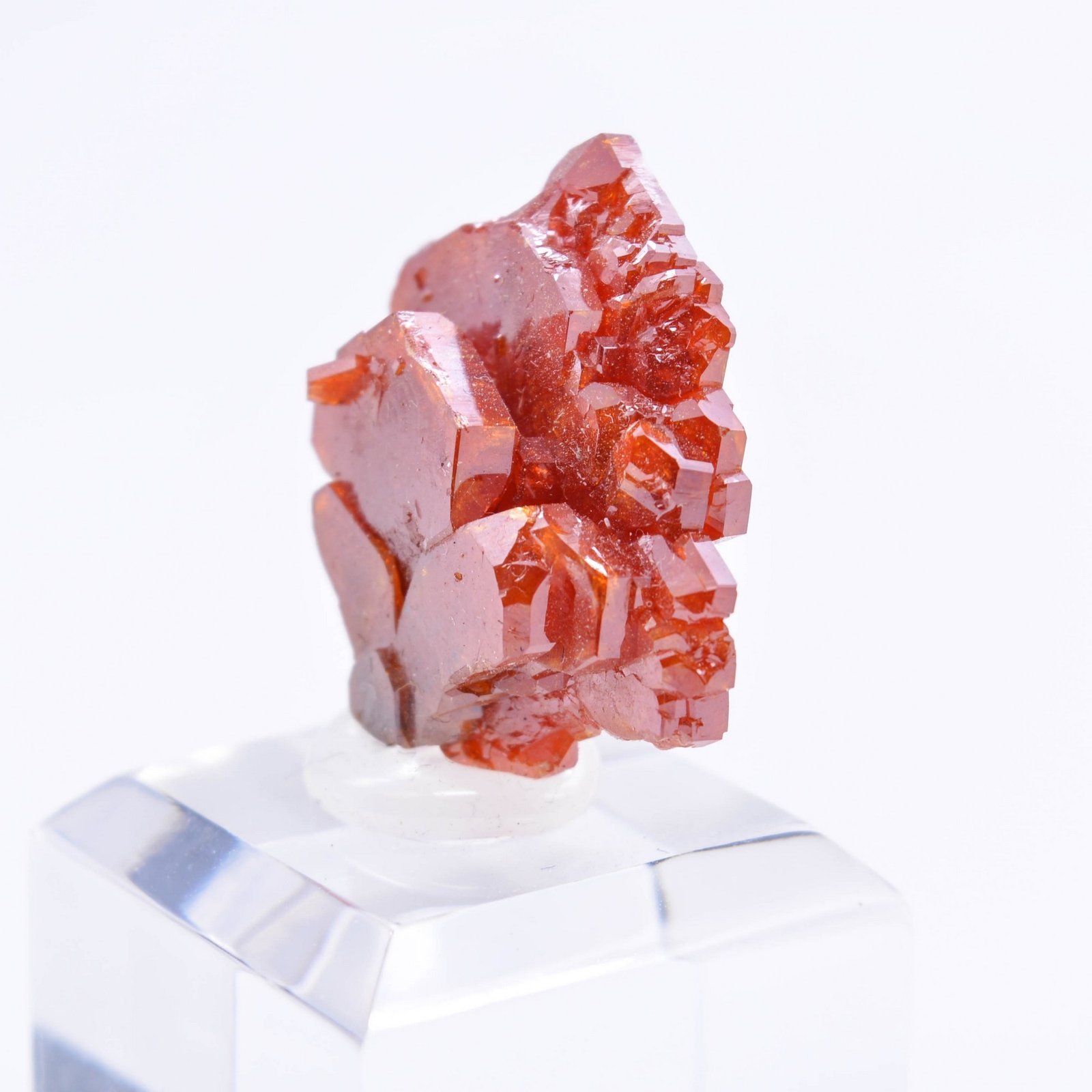 Floating group of vanadinite crystals of a superb bright red and extreme brilliance. Some very slight imperfections are to be noted for the most fastidious.