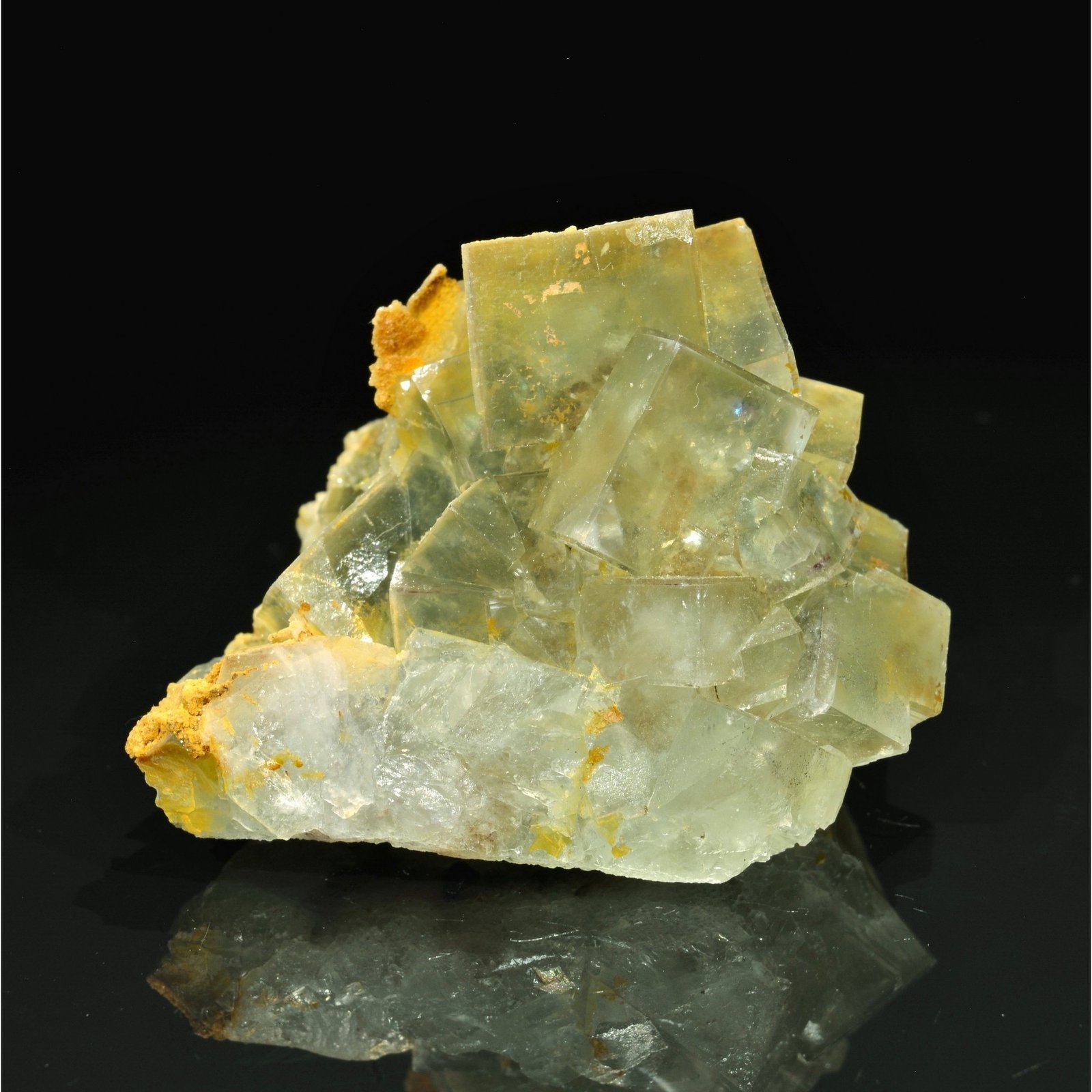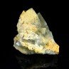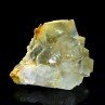 Slightly green, translucent and bright fluorite in excellent condition, accompanied by white and orange microquartz colored by iron oxides. The core of the fluorite is fluorescent yellow / orange under long Uvs. Piece sawed at the base.