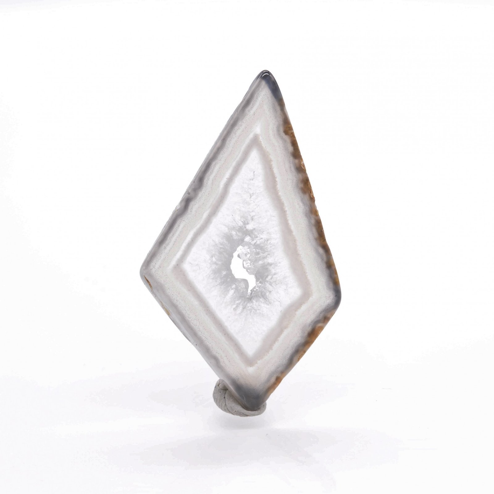 Polished slice of polyhedral agate, which can be appreciated as such for collection or mounted as a pendant. Polyhedral agates were discovered in the 1970s in the state of Paraíba, Brazil. They were formed by complete or partial filling of cavities of polyhedral shapes, interpreted as the space present between ancient crystals not determined but often assumed to be calcite (see Le Règne Minéral magazine #163).