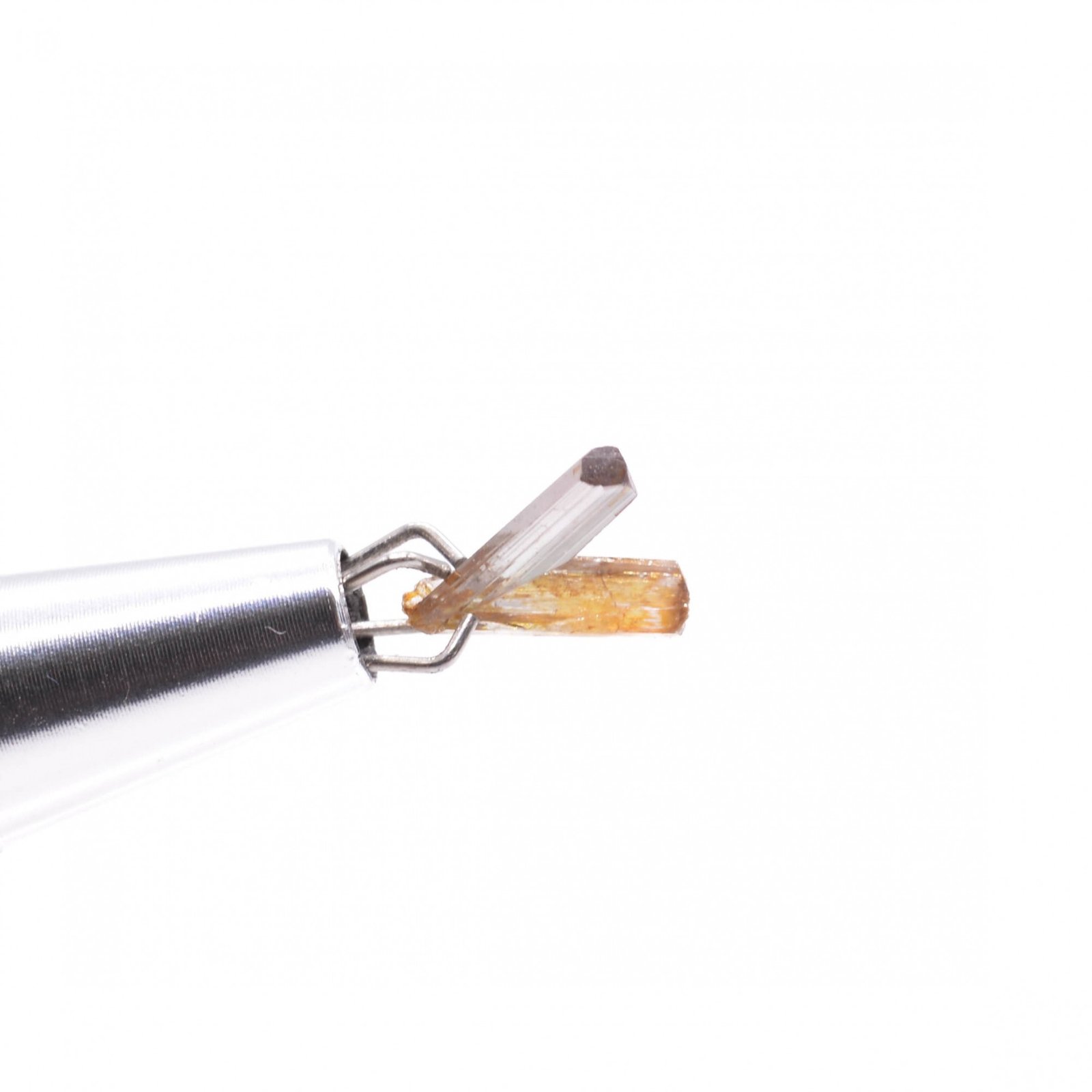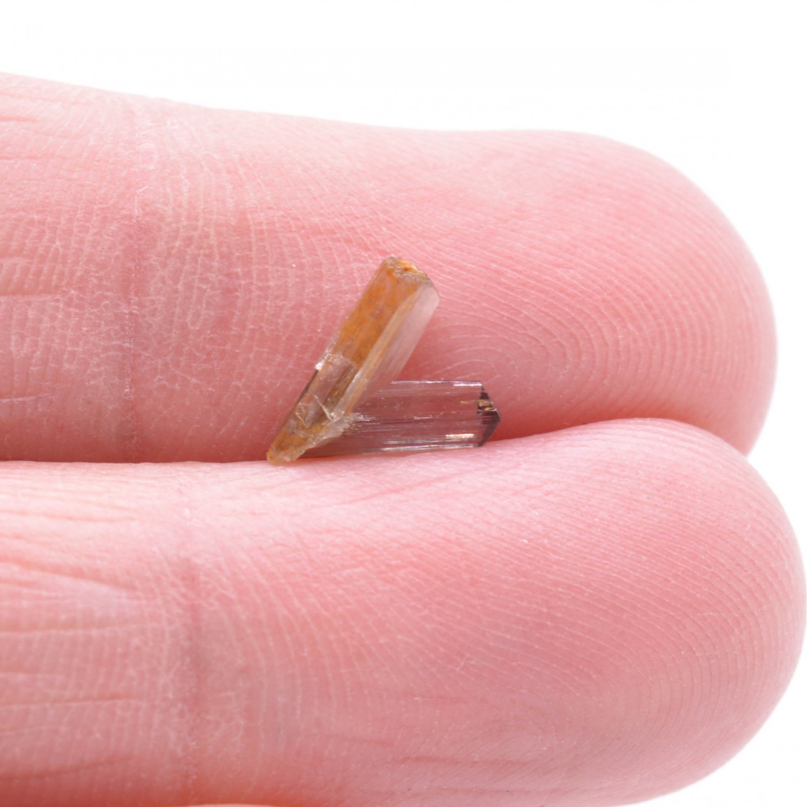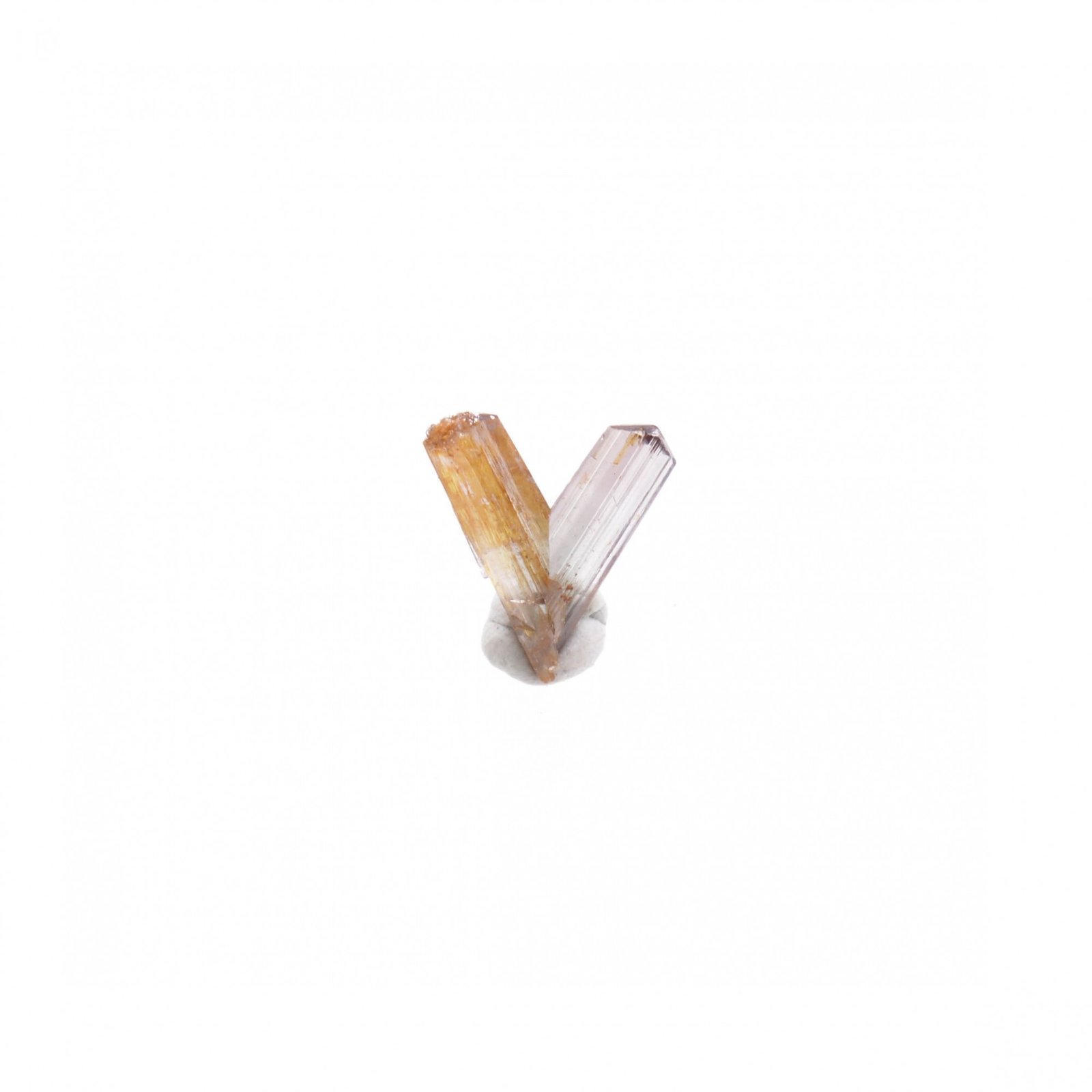 Rare v-twinned diaspore crystals, both shiny. One of the two crystals is slightly purple, gemmy and well terminated while the second one has a less clear termination and an orange coloration linked to iron oxides having penetrated inside the crystal by a small crack present on the side. The tip is however intact, which is not common.
