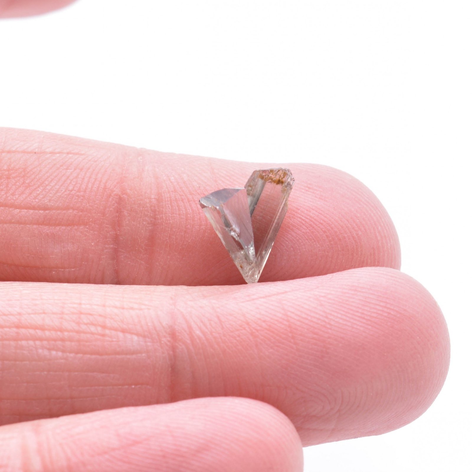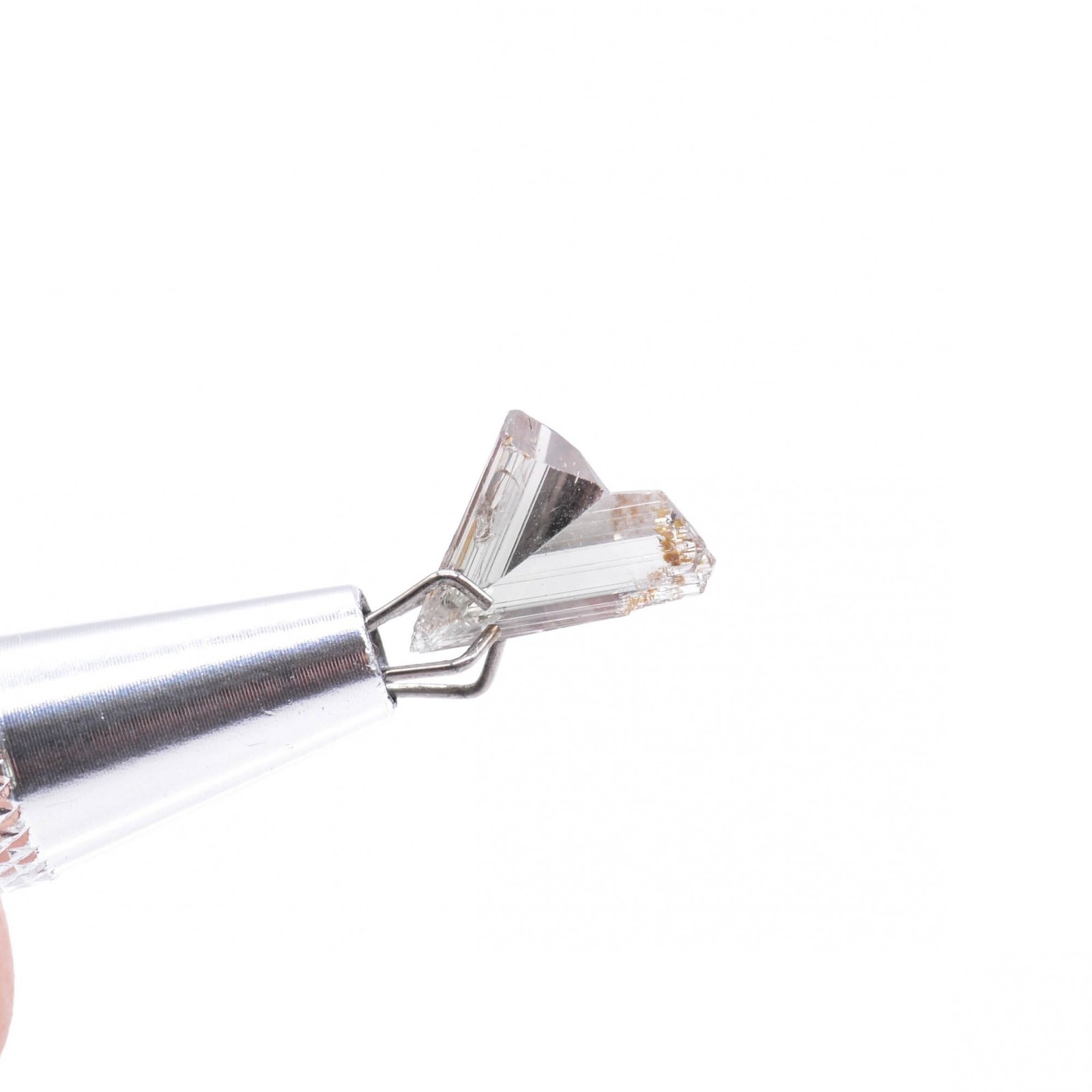 Rare diaspore crystals twinned as a heart shape, both with a very nice luster, gemmy and well finished, and presenting a pinkish to slightly green color depending on the angle and the light. The tip is classically very slightly damaged.