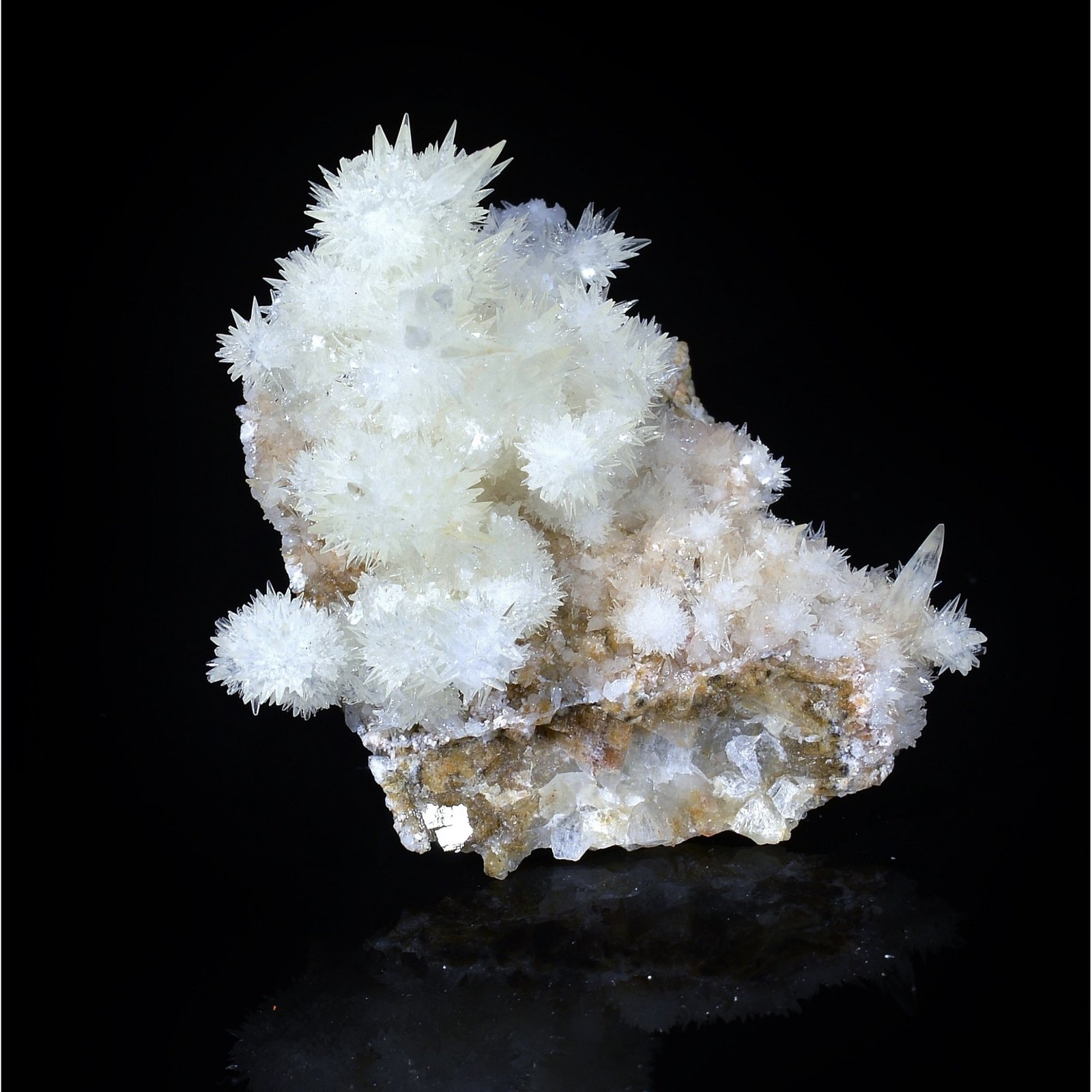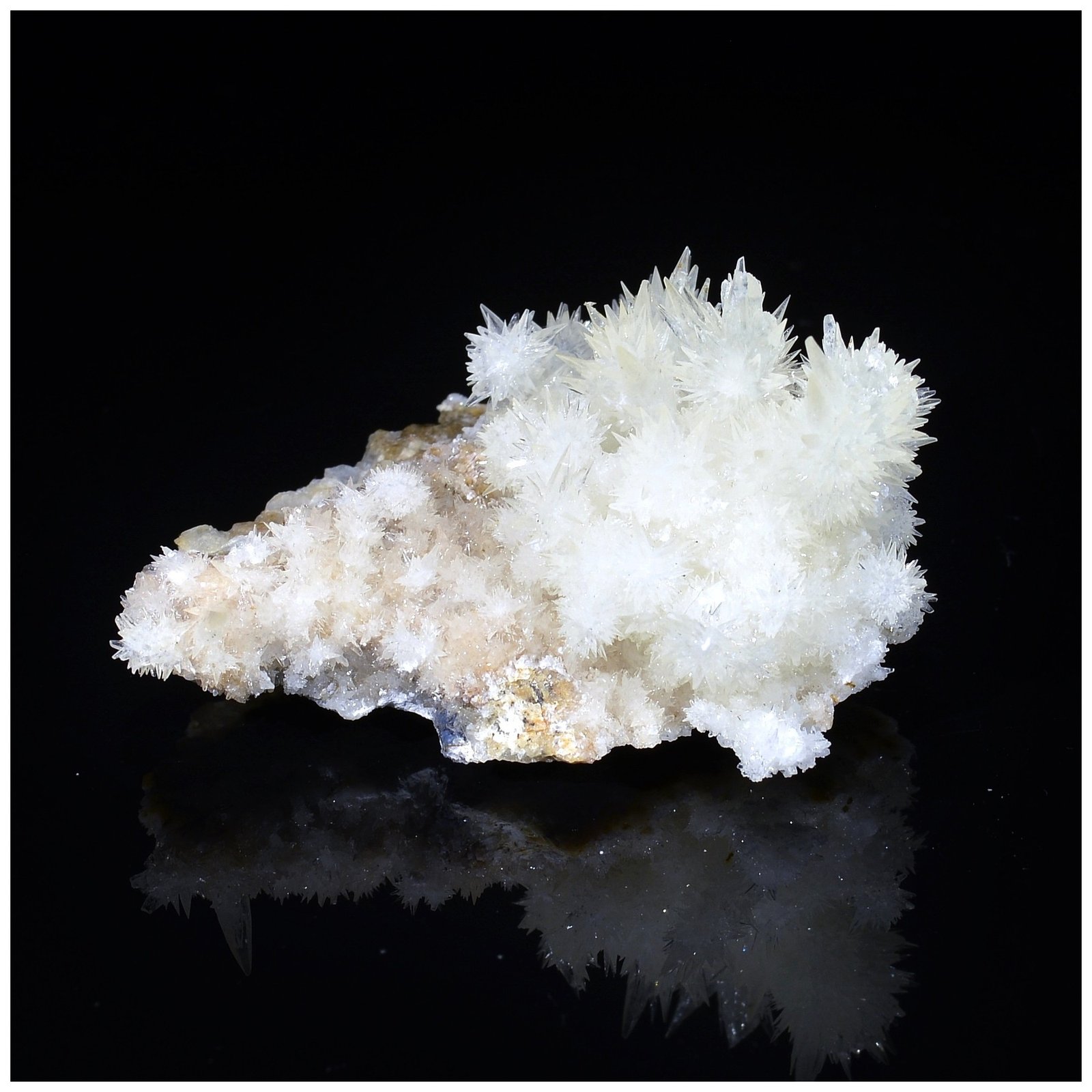 New discovery (spring 2022) of a small pocket of very delicate calcites at the Qinglong mine (Dachang) in China. This piece of a beautiful brilliance is presented on gangue (less common according to the pieces we have seen). The calcite crystallized in bunches of small scalenohedrons very "sharp", is colorless to very very pale yellow. The endings are in very good condition considering the delicacy of this type of piece. The shipment will obviously be very careful.