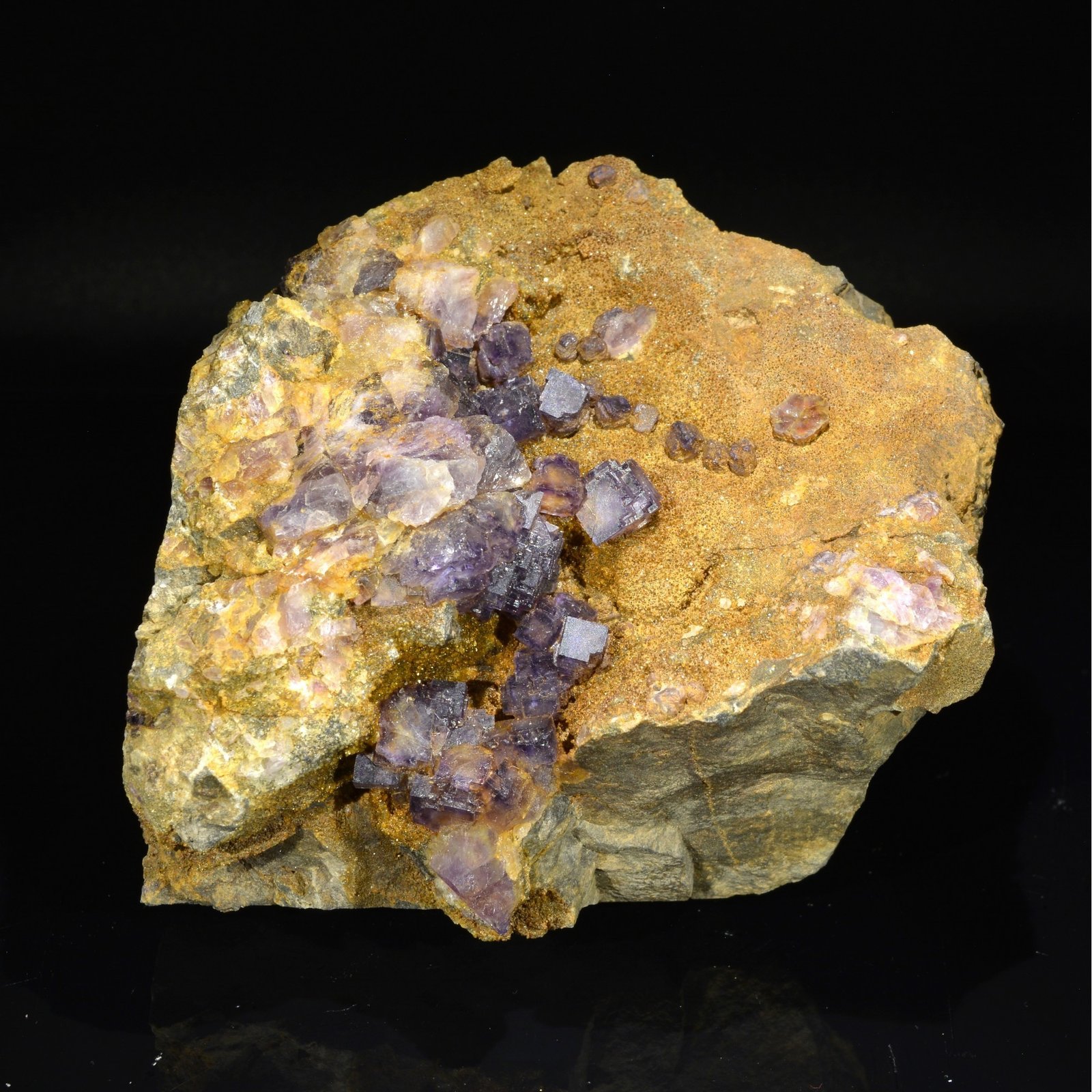 Cubic violet fluorite (rarer than the "Aztec pyramid" fluorites) up to 7 mm and some in Aztec pyramid, all on quartzite matrix. The rims are in fact darker than the core. Piece coming from Rancennes in the Ardennes. This area was classified as a regional natural park in 1999. This piece comes from an old discovery that remained for many years with a local prospector and collector.