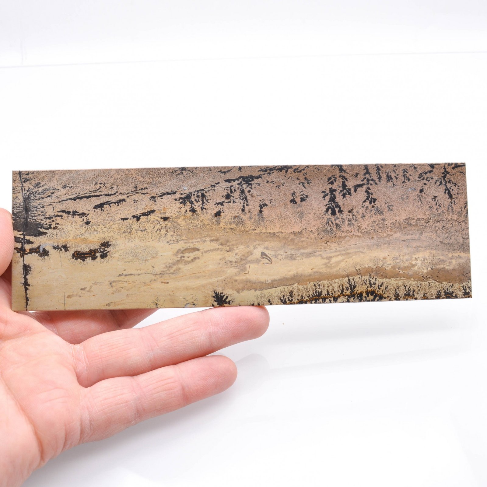 Landscape stone from China, rectangular in shape, in the manner of Italian paesine. It is a very fine-grained limestone slab, sawn and polished, with colors governed by the iron oxide content (the reddest being the rarest), and with patterns naturally formed by manganese dendrites. Also called "Guohua stone", "picture stone" or "painting stone".