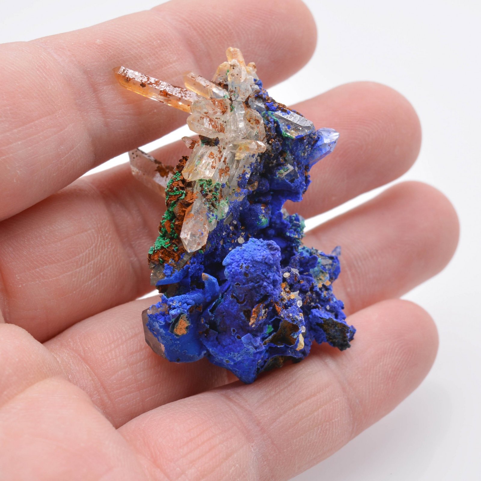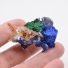 Aesthetic and rare association for the locality of quartz partially covered with iron oxides (some presenting the habitus of the dauphiné), azurite, and malachite in small spheres covering a small mineral pseudomorphosed in limonite which can be related to siderite, and especially of tetraèdrite pseudo or perimorphosed in azurite (on the right part of the piece by looking at the first photograph). Some partial perimorphs are present on the back. This coin comes from the Giraud mine, close to the famous La Gardette mine, known worldwide for its gold and especially the quality of its quartz. This type of coin is very unusual and therefore extremely rare on the market!