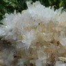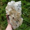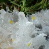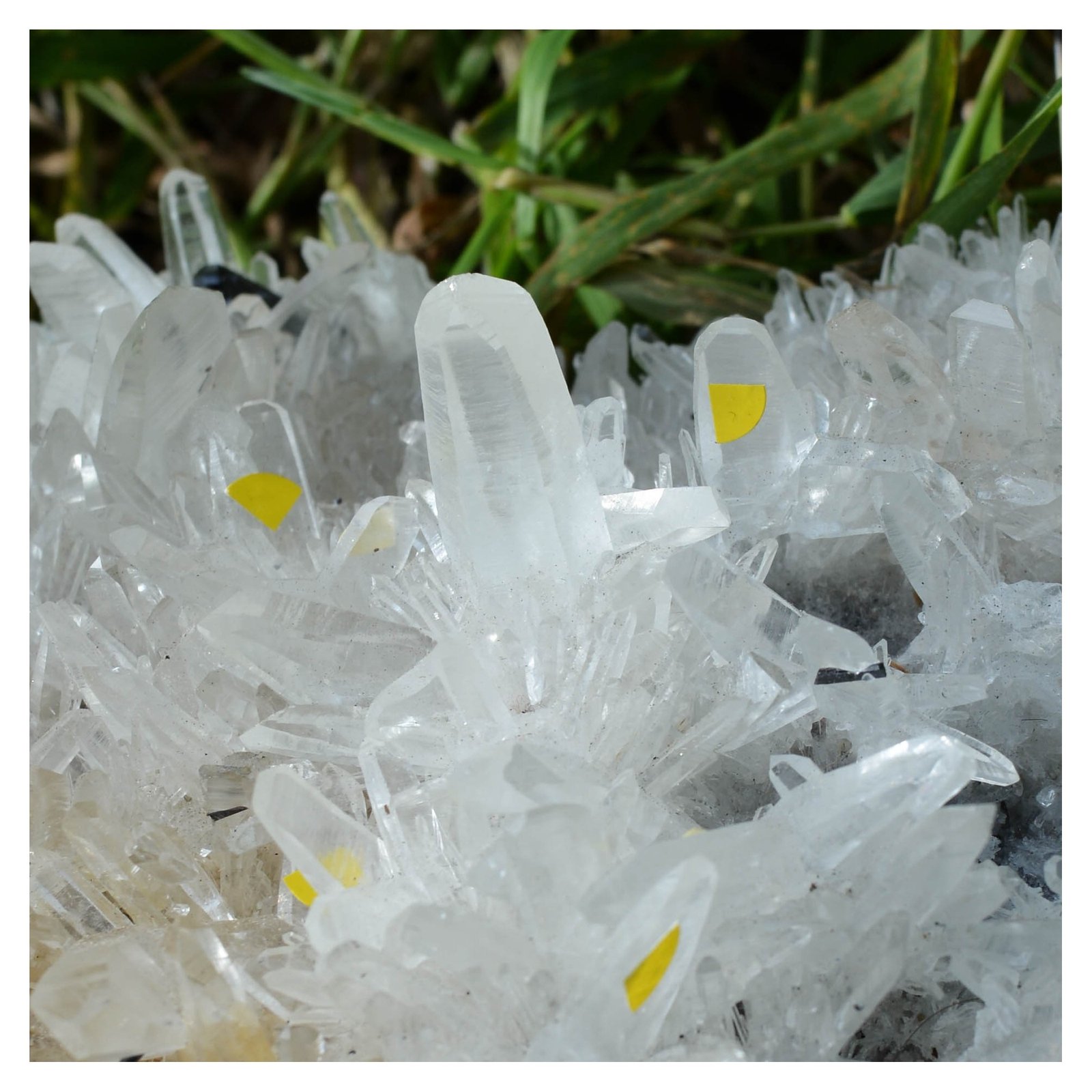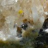 This piece is composed of quartz with no less than 20 macles from Japan (marked by yellow stickers, paradoxically quite complicated to show on a picture as the arrangement of the quartz is so dense), in association with some hubnerite crystals and some fluorite boxworks.