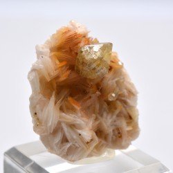 Brilliant, translucent cerussite on pink/orange crested barite, accompanied by small cubes of galena. Cerusite is of a beautiful yellow color under long Uvs. A very aesthetic and good quality Moroccan classic!