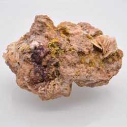 Association of fluorite in small violet to colorless crystals, of pinkish crested barite, of mimetite in small green barrels and of some small crystals of wulfenite, the whole on a massive but not imposing quartz matrix. The classic Lantignié paragenesis that we like to find on the same sample!