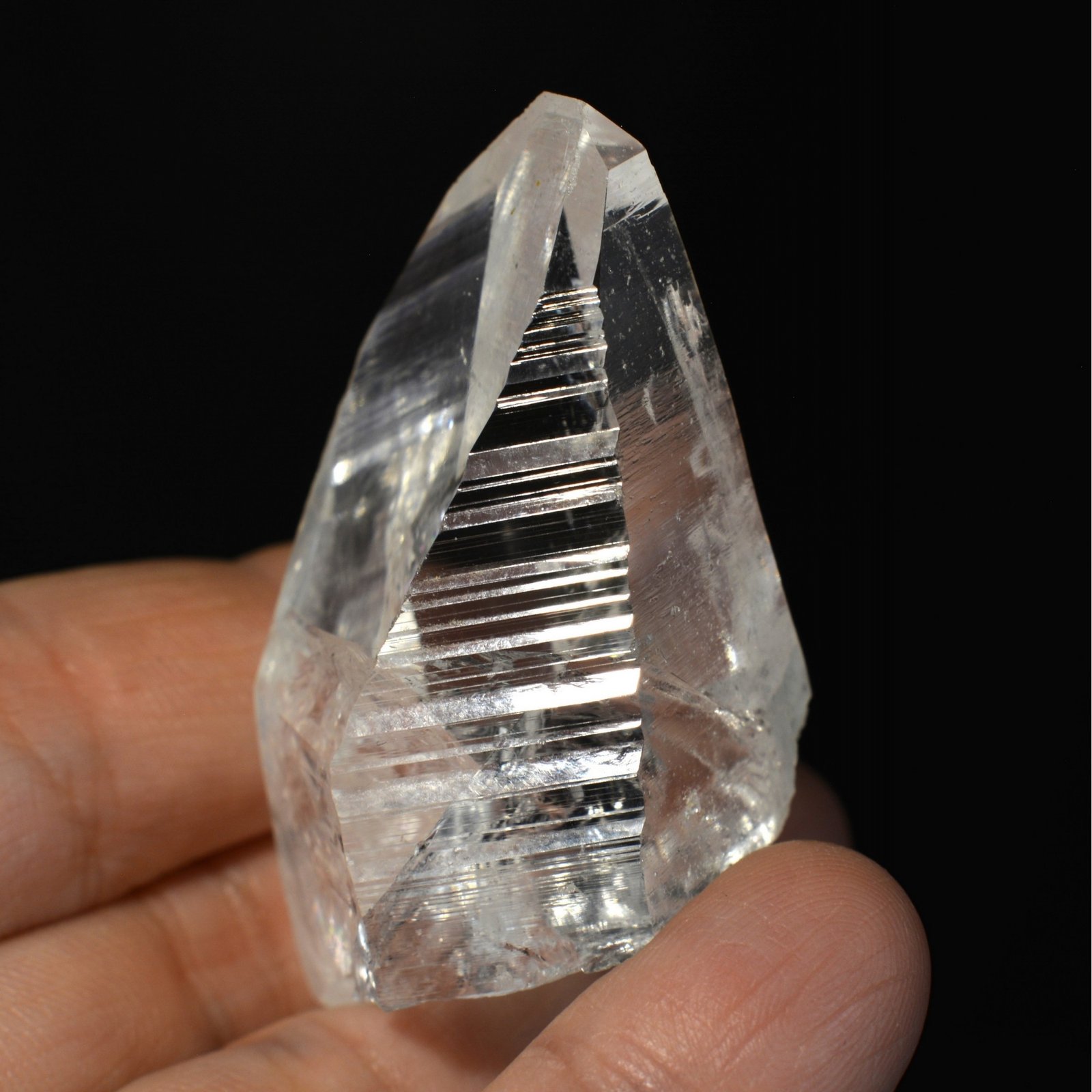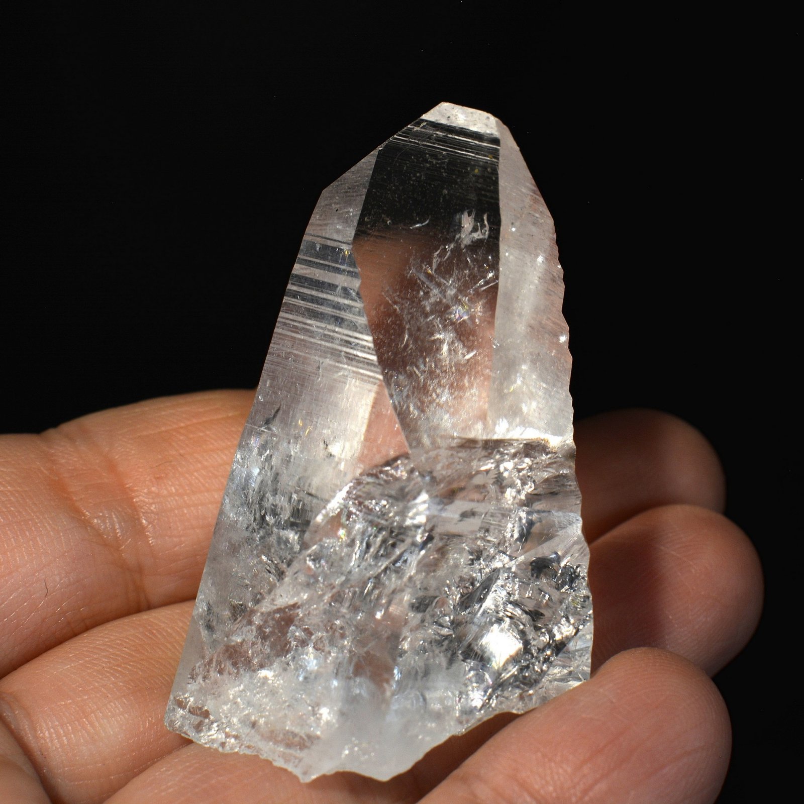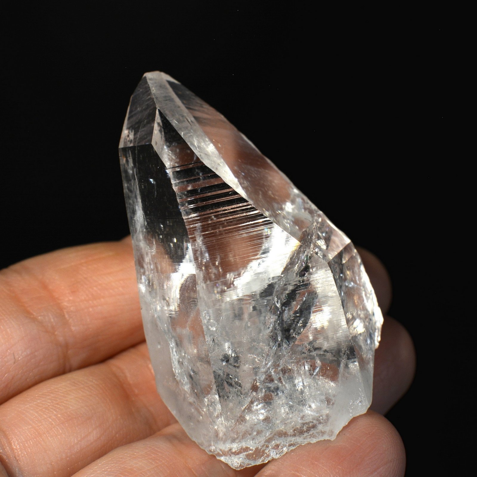 Colorless quartz point, well translucent, shiny and intact, showing nice growth streaks.