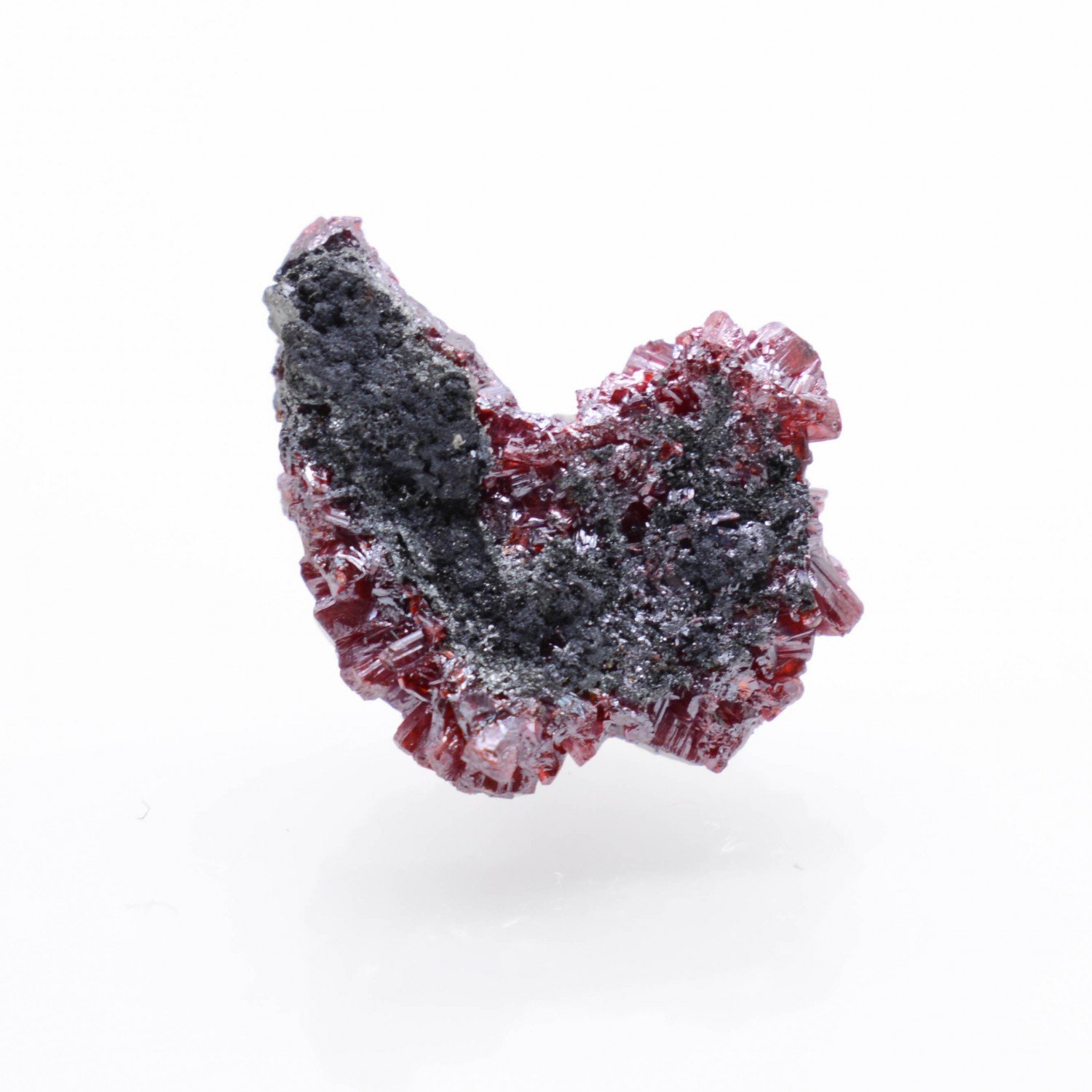 Set of prismatic crystals of proustite (also known as red silver), bright red and very shiny. Some crystals are slightly rubbed. Important facts to know about proustite: it contains arsenic and is highly photosensitive.
