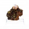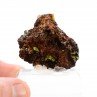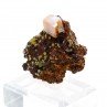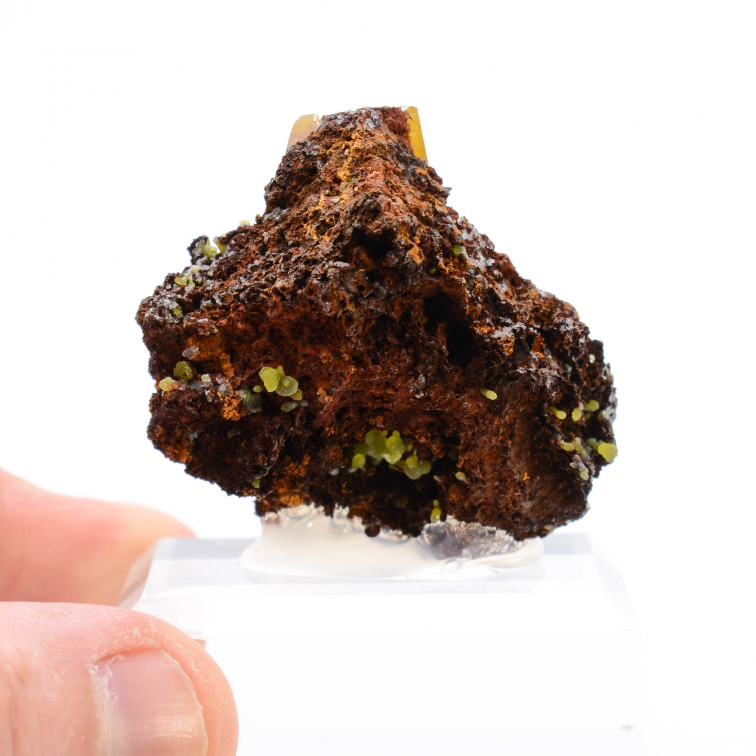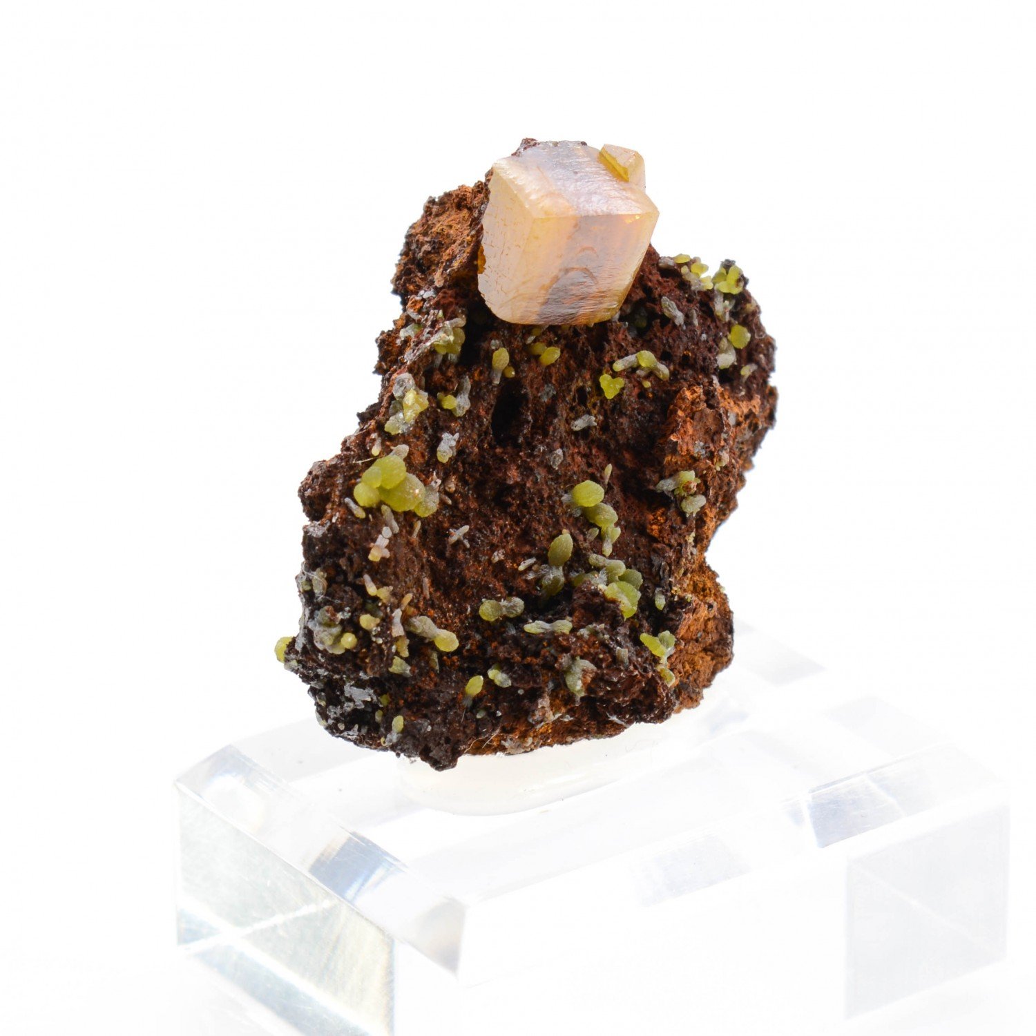 Wulfenite crystal with interesting color variations (yellow at the edges, orange then brown towards the center), in perfect condition and with shiny surfaces, accompanied by small spheres of green mimetite and small "bow-tie" crystals of adamite, all on limonite.