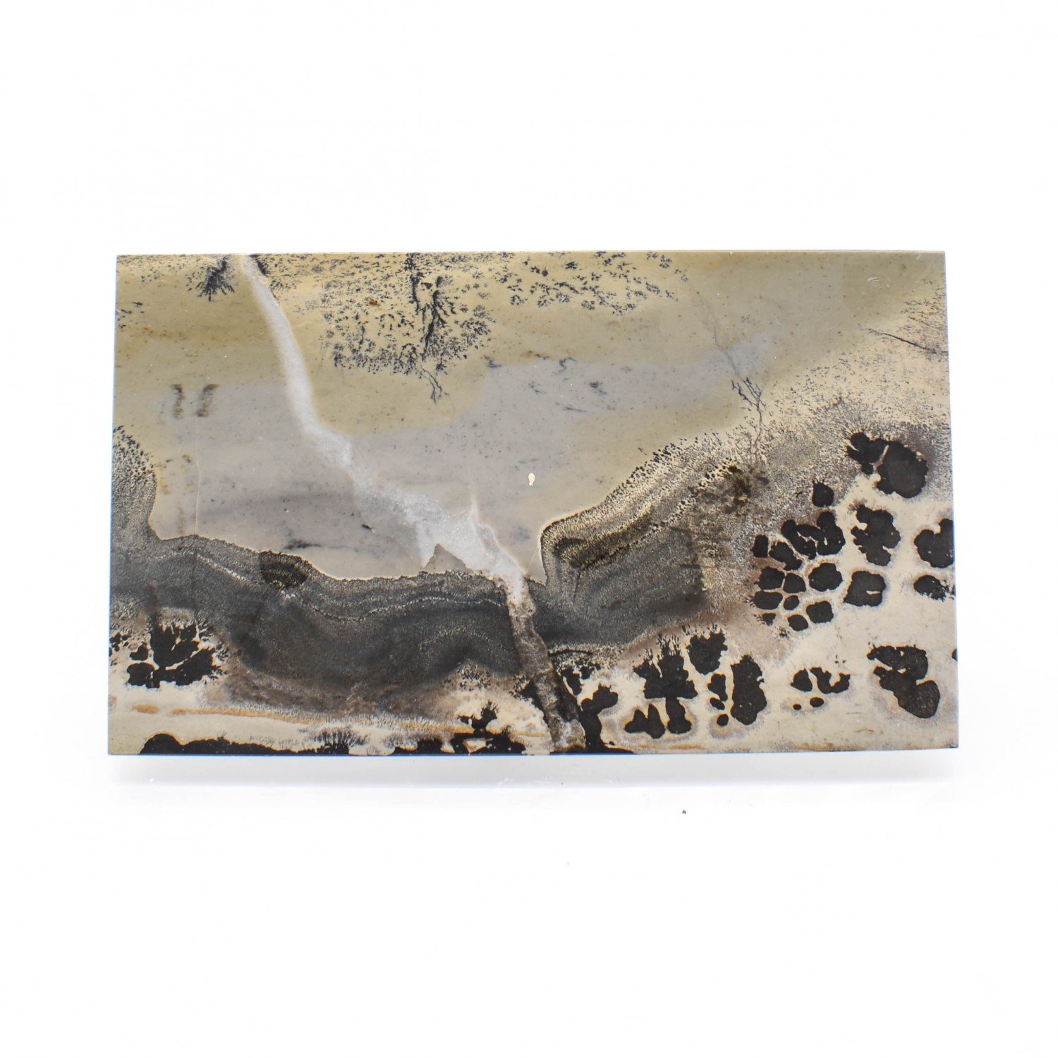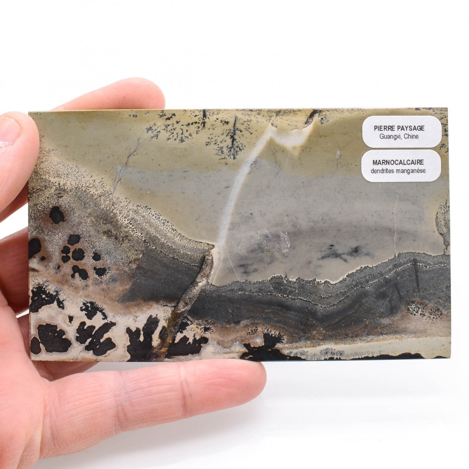 Rectangular Chinese landscape stone in the style of Italian paesine. These are very fine-grained slabs of limestone, sawn and polished, with colors governed by iron oxide content (the reddest being the rarest), and patterns naturally formed by manganese dendrites. Also known as "Guohua stone", "picture stone" or "painting stone".
