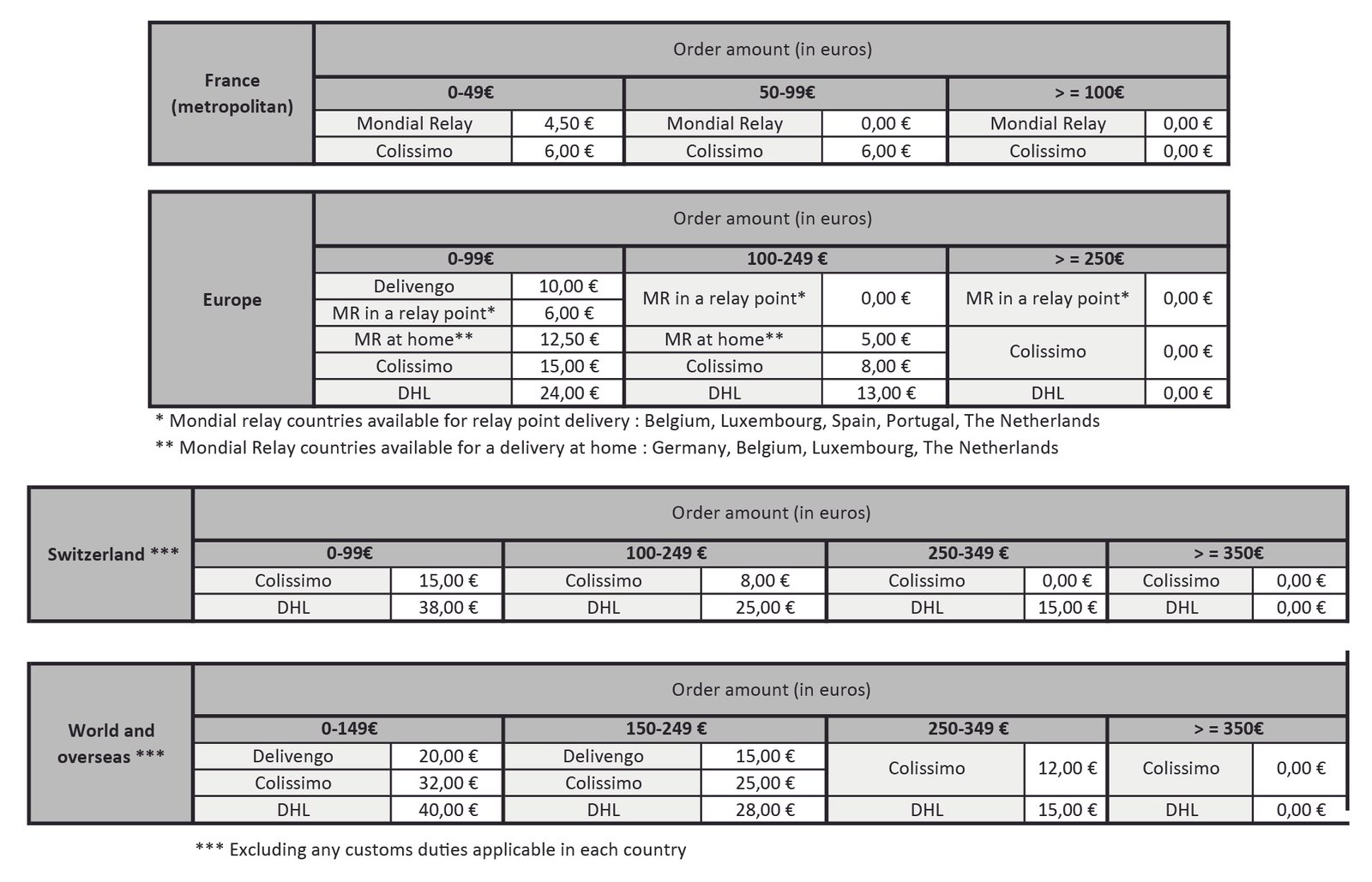 DHL : Shipment with tracking, delivery against signature. Delivery at home in 48h for Europe and one week for the rest of the world.