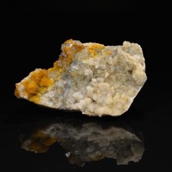 Fluorine verte, translucide et brillante, associée à de nombreux petits scalénoèdres de calcite orangée, d'une localité peu commune.