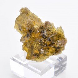 Rare pièce flottante composée de fluorine et de barytine, provenant de la mine Bergmännisch Glück en Allemagne. Les cristaux ont une belle couleur jaune ambrée et un superbe zonage bleu et violet mis en valeur par rétroéclairage, selon les angles. La barytine, de couleur dorée et de forme allongée à la terminaison en "sifflet" réagit en jaune aux UVs longs tandis que la fluoirne prend une belle couleur pourpre.