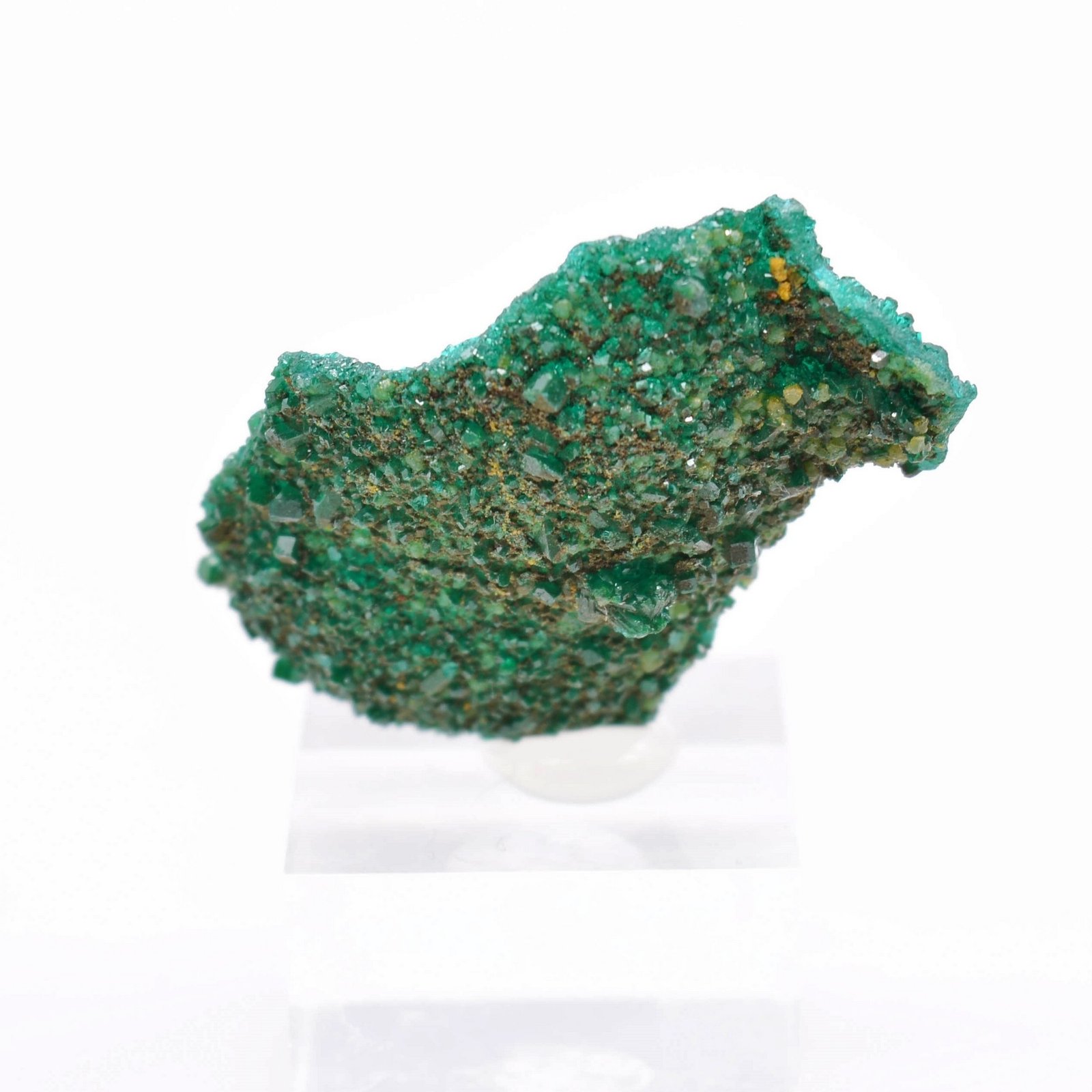 Petits cristaux très brillants de dioptase . Un peu de duftite et de mimétite sont présents à l'arrière.