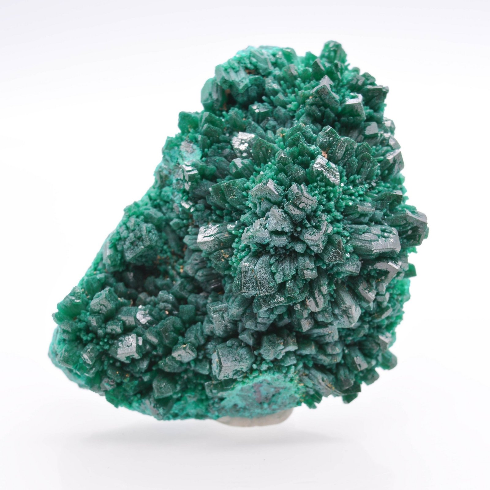 Groupe de cristaux de dioptase de différentes tailles, relativement brillants, en excellente condition, et au relief agréable.