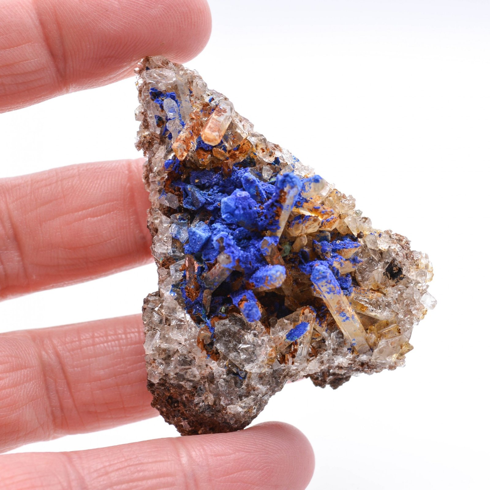 Petite plaque de quartz partiellement recouvert d'azurite et association surtout une petite pseudomorphose de tétraèdrite en azurite de 3 mm d'arête, rare pour la localité : la mine à Giraud, voisine de la célèbre mine de La Gardette mondialement connue notamment pour son or et surtout la qualité de ses quartz.