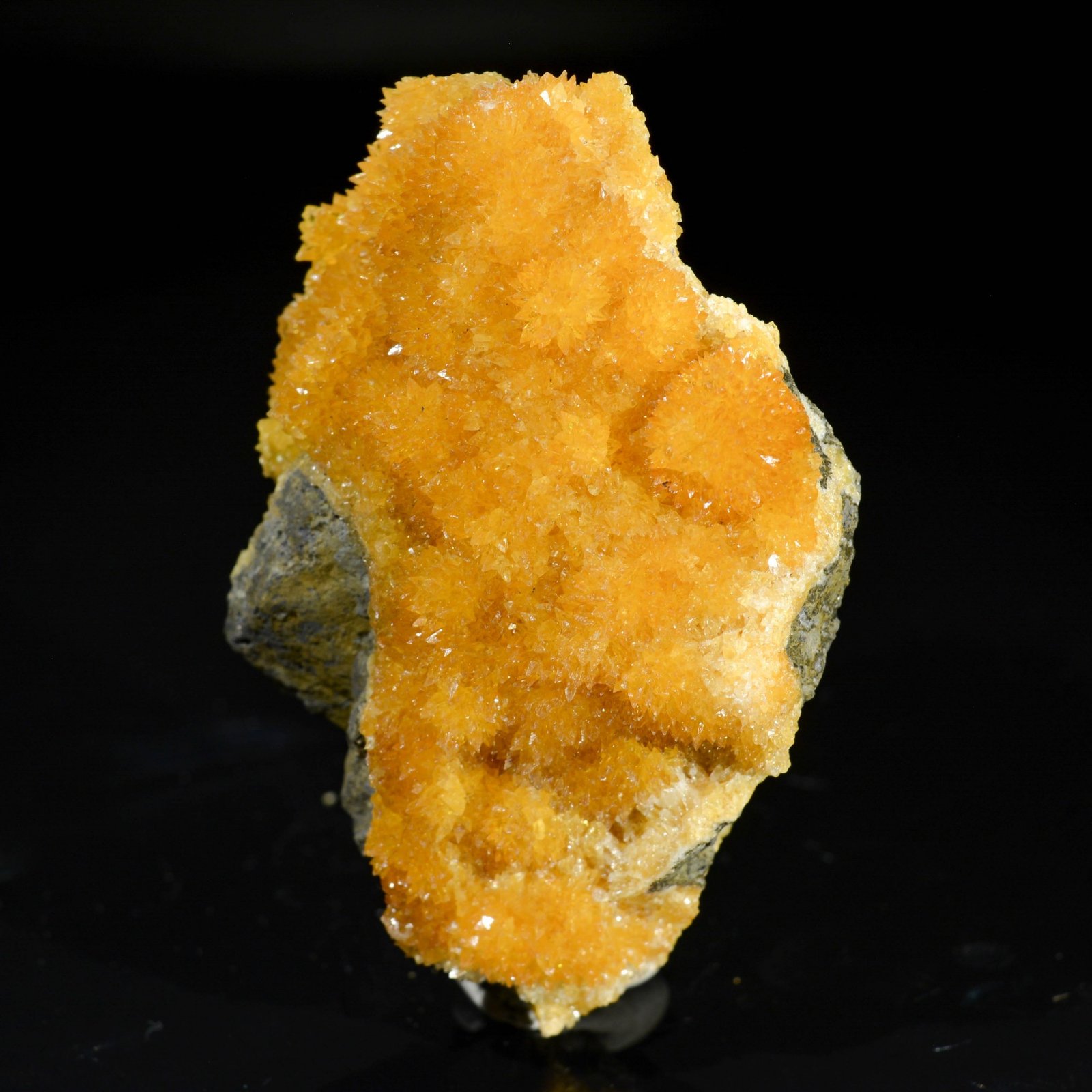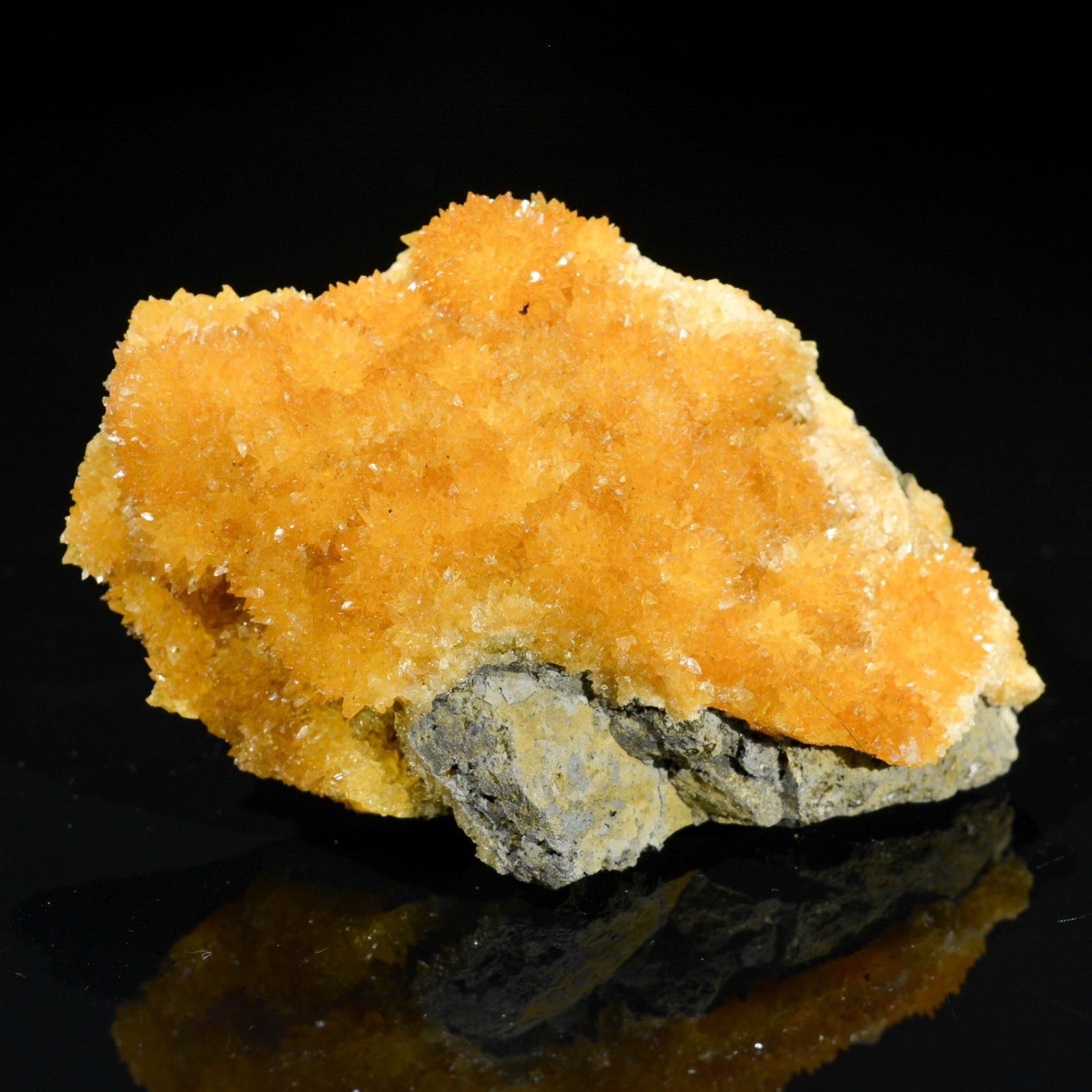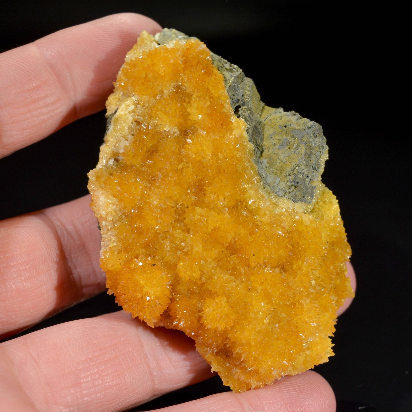 Petits scalénoèdres de calcite d'un bel orange soutenu sur basalte. La calcite est fluorescente aux Uvs longs.