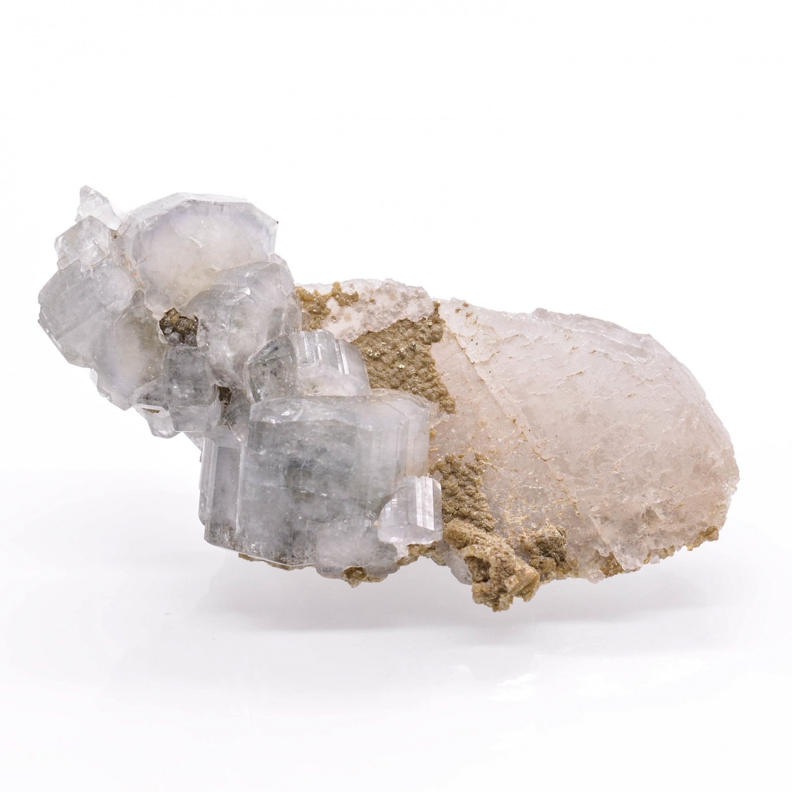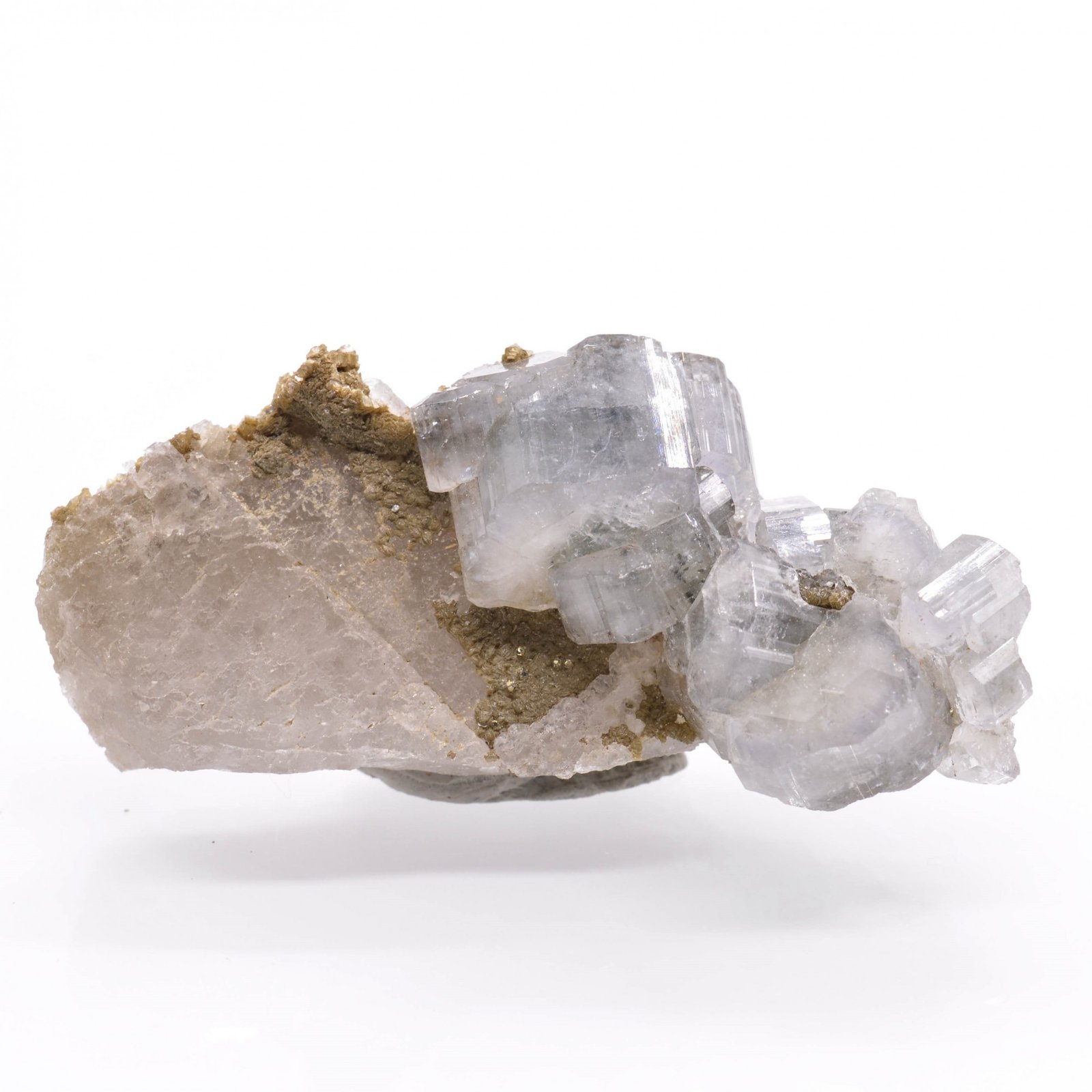 Cristaux d'apatite d'un bleu très clair brillants, en très bonne condition (de très très légères ébréchures sont à noter pour les perfectionnistes) sur quartz. Celui-ci est sans forme particulière mais présente d'intéressantes figures de dissolution. Quelques microsphères de pyrite et pétales de sidérite complètent la paragenèse.