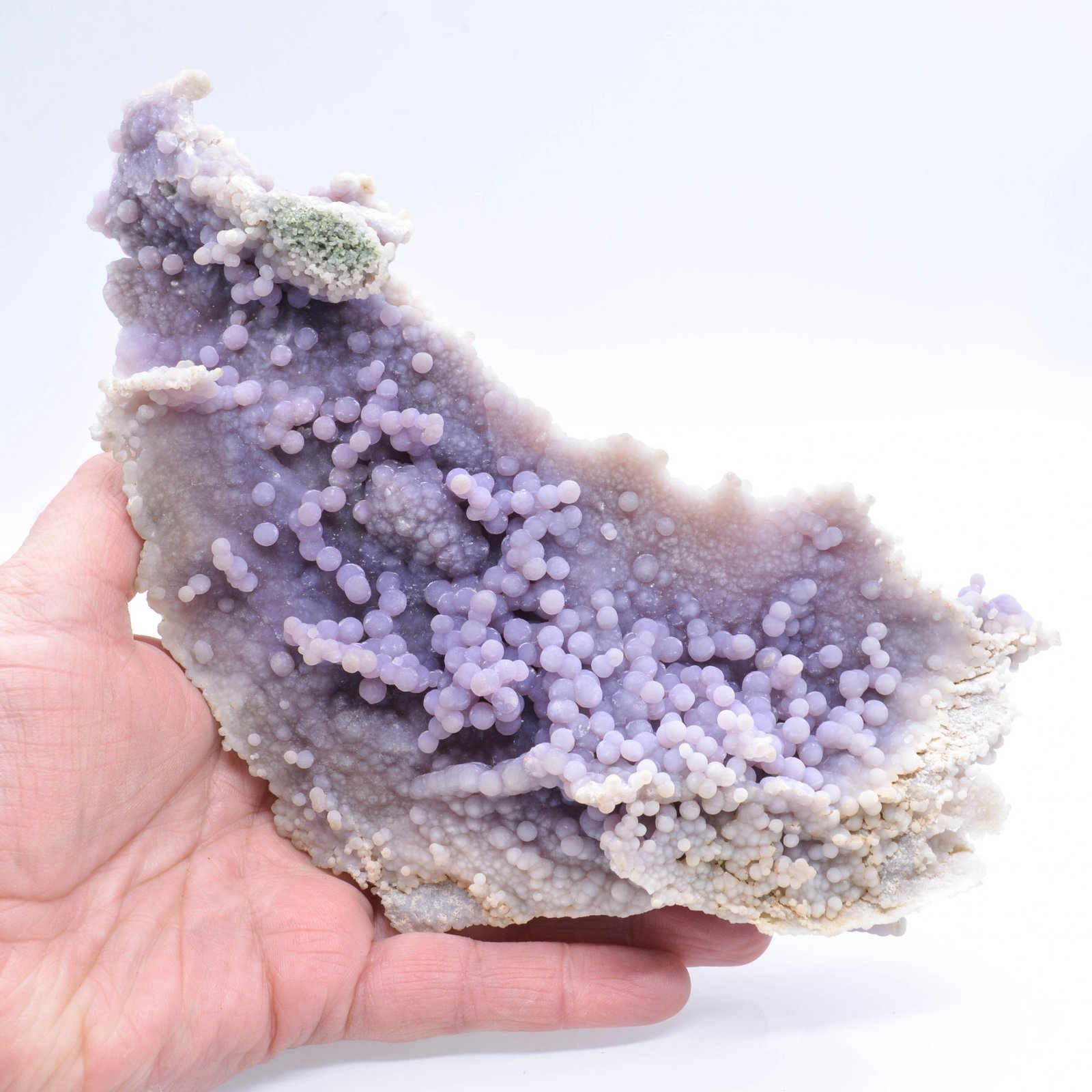 Améthyste botryoïdale, communément appelée "calcédoine grappe", d'une jolie couleur lavande et de forme originale. Quelques chocs mineurs.