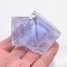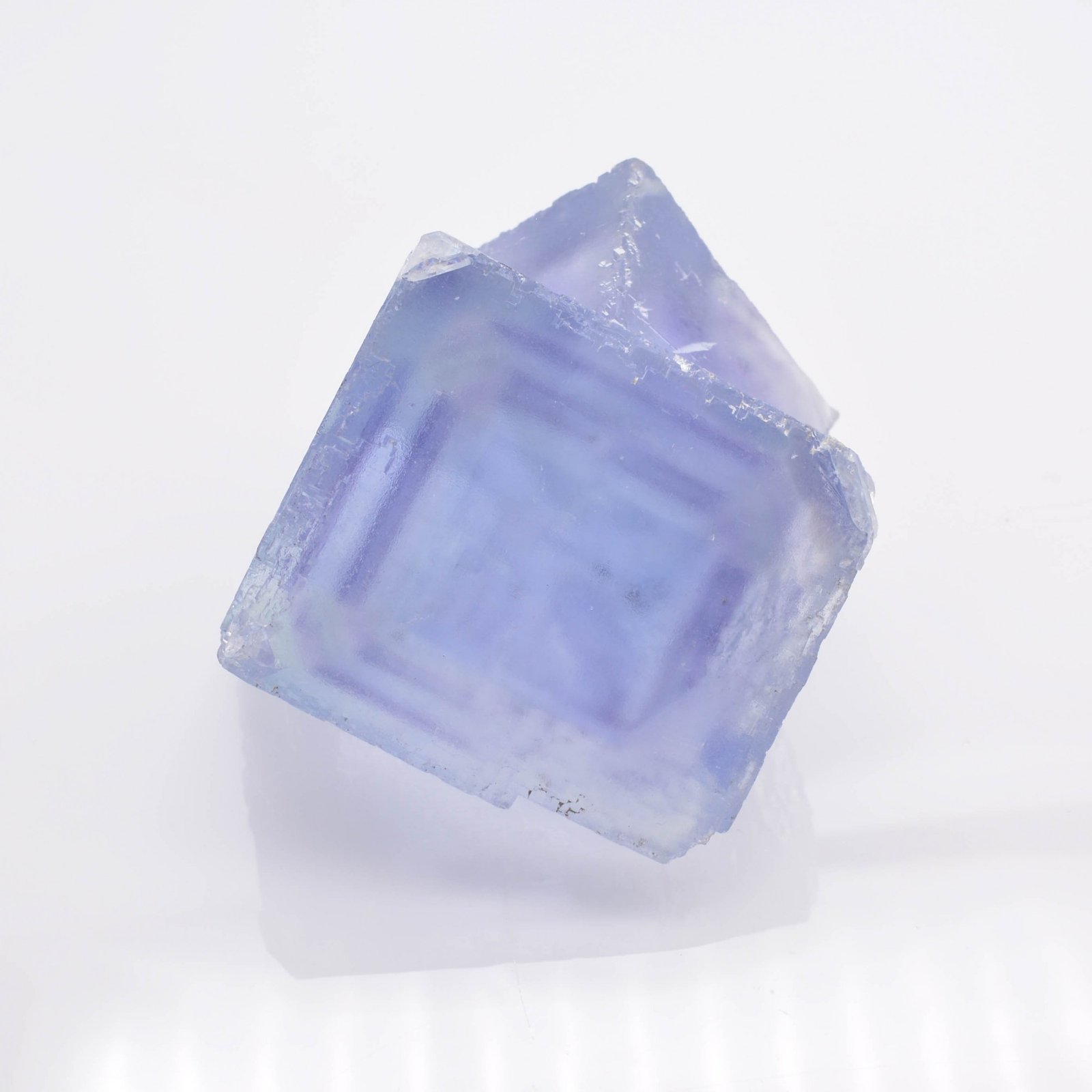 Duo flottant de fluorine d'un bleu clair translucide présentant des fantômes bleus/violets bien marqués sur les côtés mais absents au niveau des coins. La surface, à l'aspect givré, est brillante. Pièce en très bonne condition malgré quelques clivages.