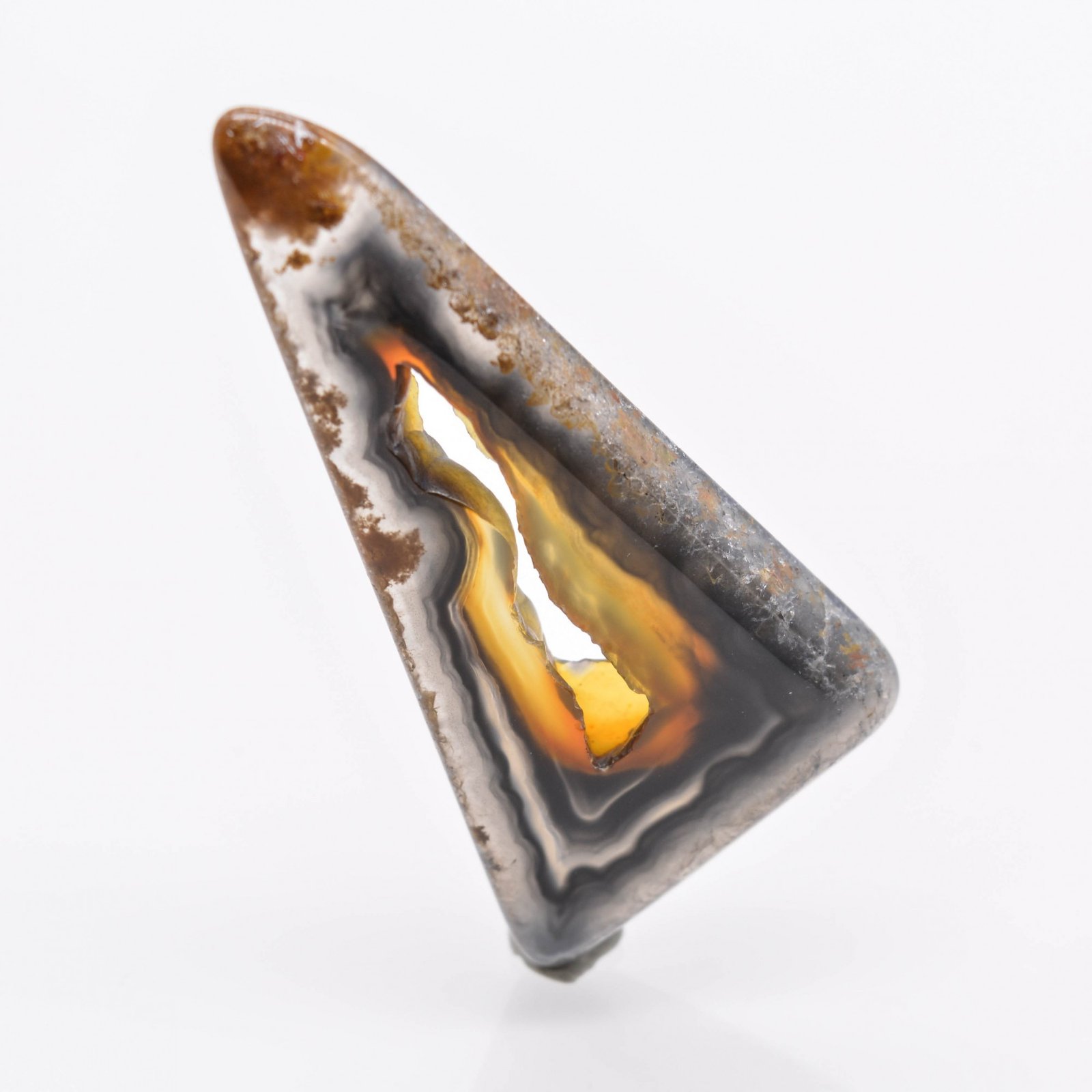 Tranche polie d’agate polyédrique, pouvant être appréciée comme telle pour la collection ou montée en pendentif. Les agates polyédriques ont été découvertes dans les années 1970 dans l’État de Paraíba au Brésil. Elles se sont formées par remplissage complet ou partiel de cavités de formes polyédriques, interprétées comme étant l'espace présent entre d’anciens cristaux non déterminés mais souvent supposés comme étant de la calcite (voir Le Règne Minéral n°163).