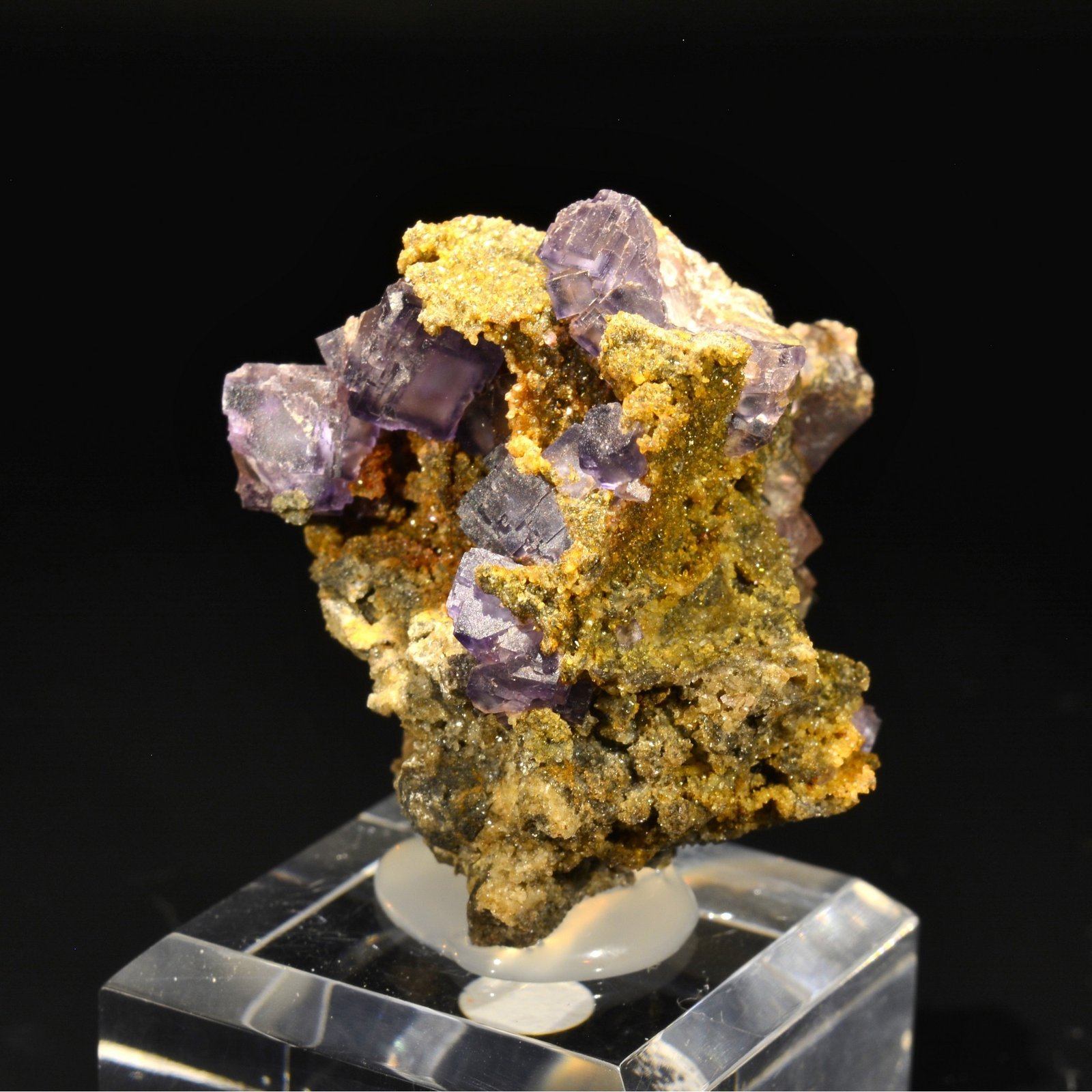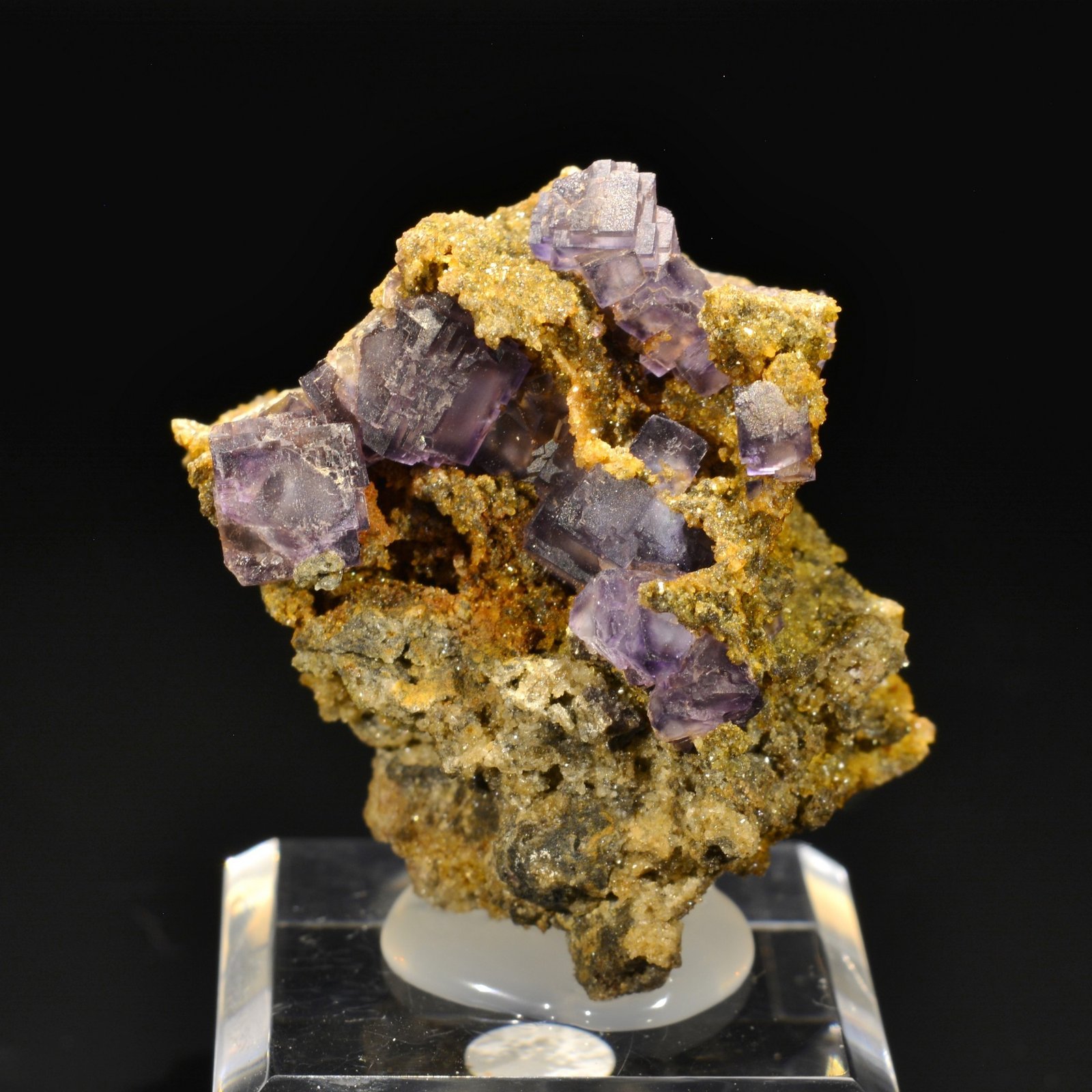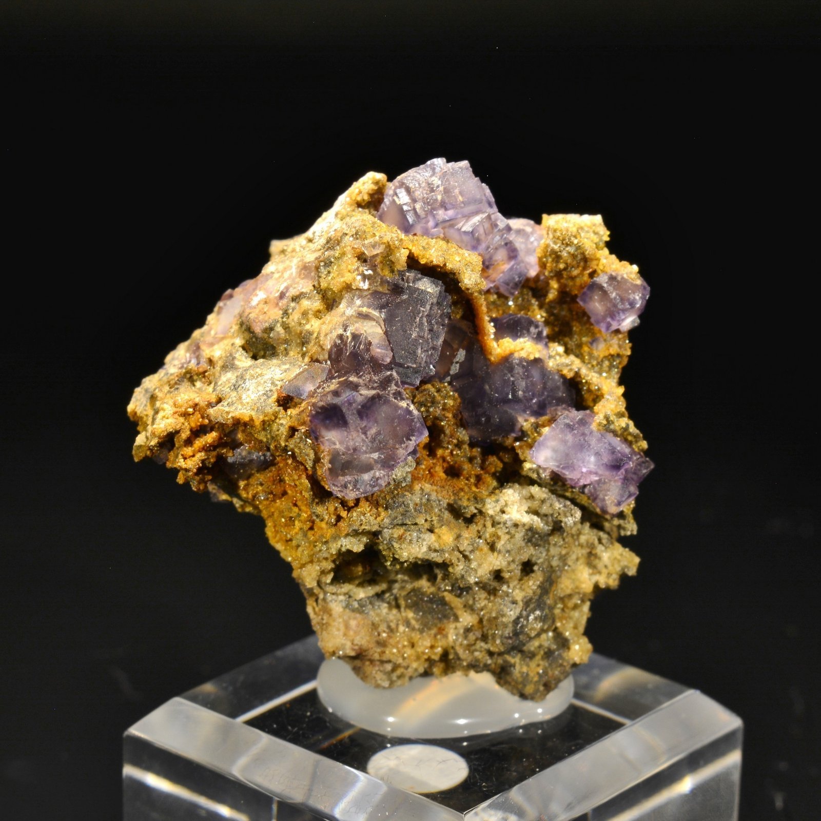 Fluorine violette cubique (plus rare que les fluorines en "pyramide aztèque") jusqu'à 9 mm, sur matrice de quartzite, provenant de Rancennes dans les Ardennes . Les bordures sont en fait plus foncées que le coeur. Ce secteur a été classé en parc naturel régional en 1999. Cette pièce est issue d'une ancienne découverte restée pendant de nombreuses années chez un prospecteur et collectionneur local.