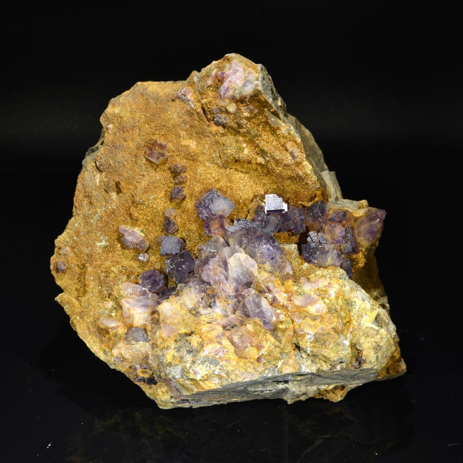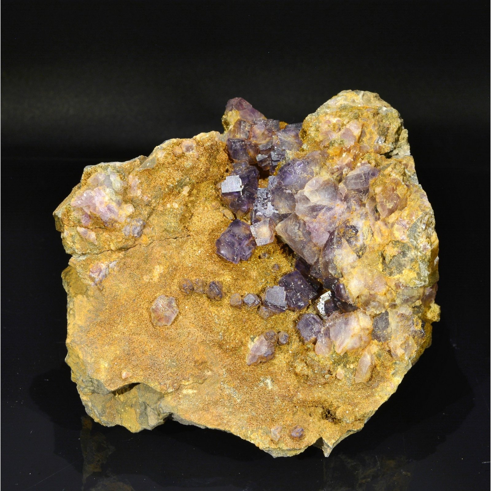 Fluorine violette cubique (plus rare que les fluorines en "pyramide aztèque") jusqu'à 7 mm et certaines en pyramide aztèque, le tout sur matrice de quartzite. Les bordures sont en fait plus foncées que le coeur. Pièce provenant de Rancennes dans les Ardennes. Ce secteur a été classé en parc naturel régional en 1999. Cette pièce est issue d'une ancienne découverte restée pendant de nombreuses années chez un prospecteur et collectionneur local.