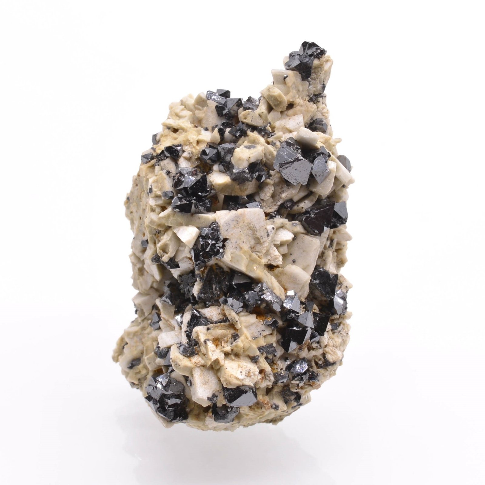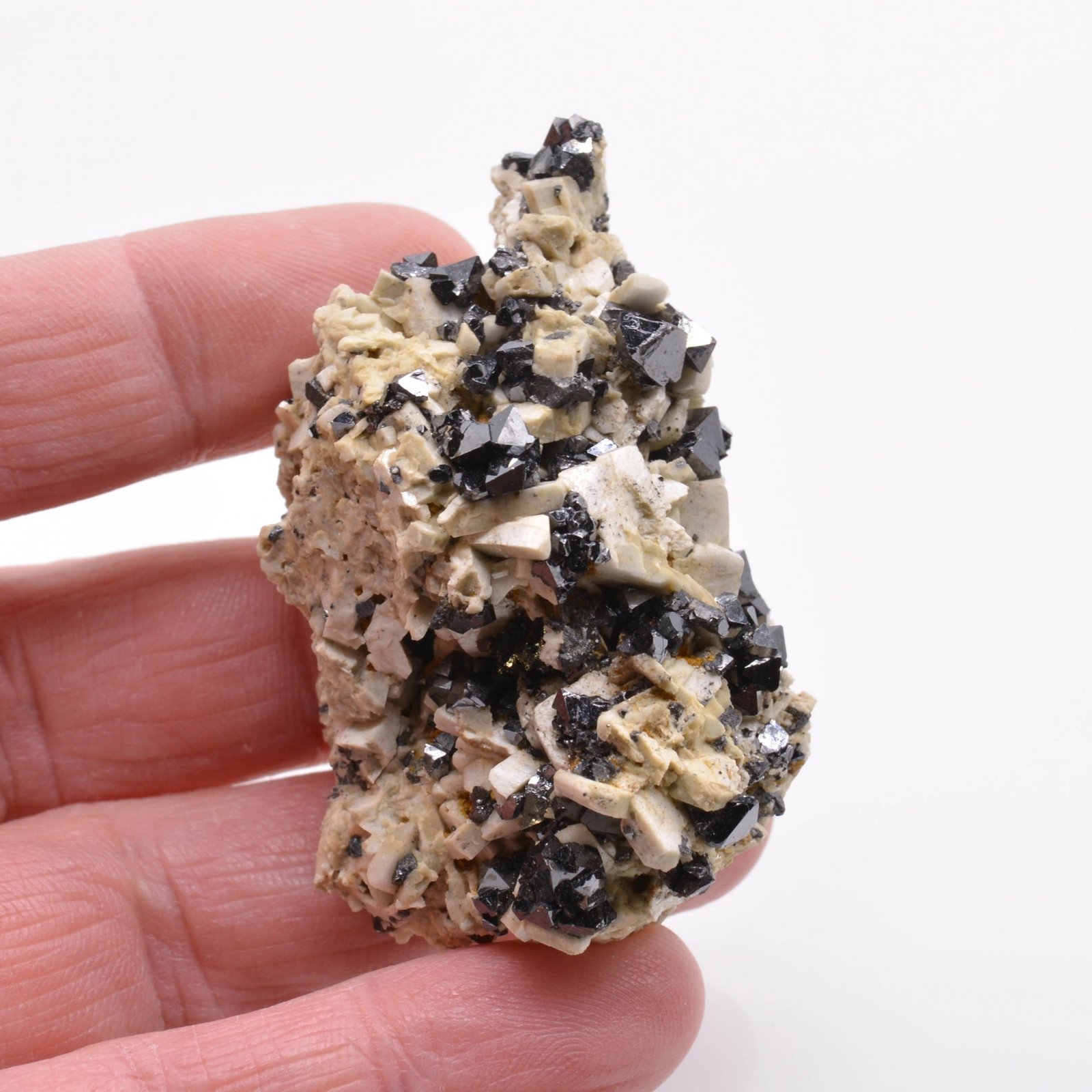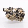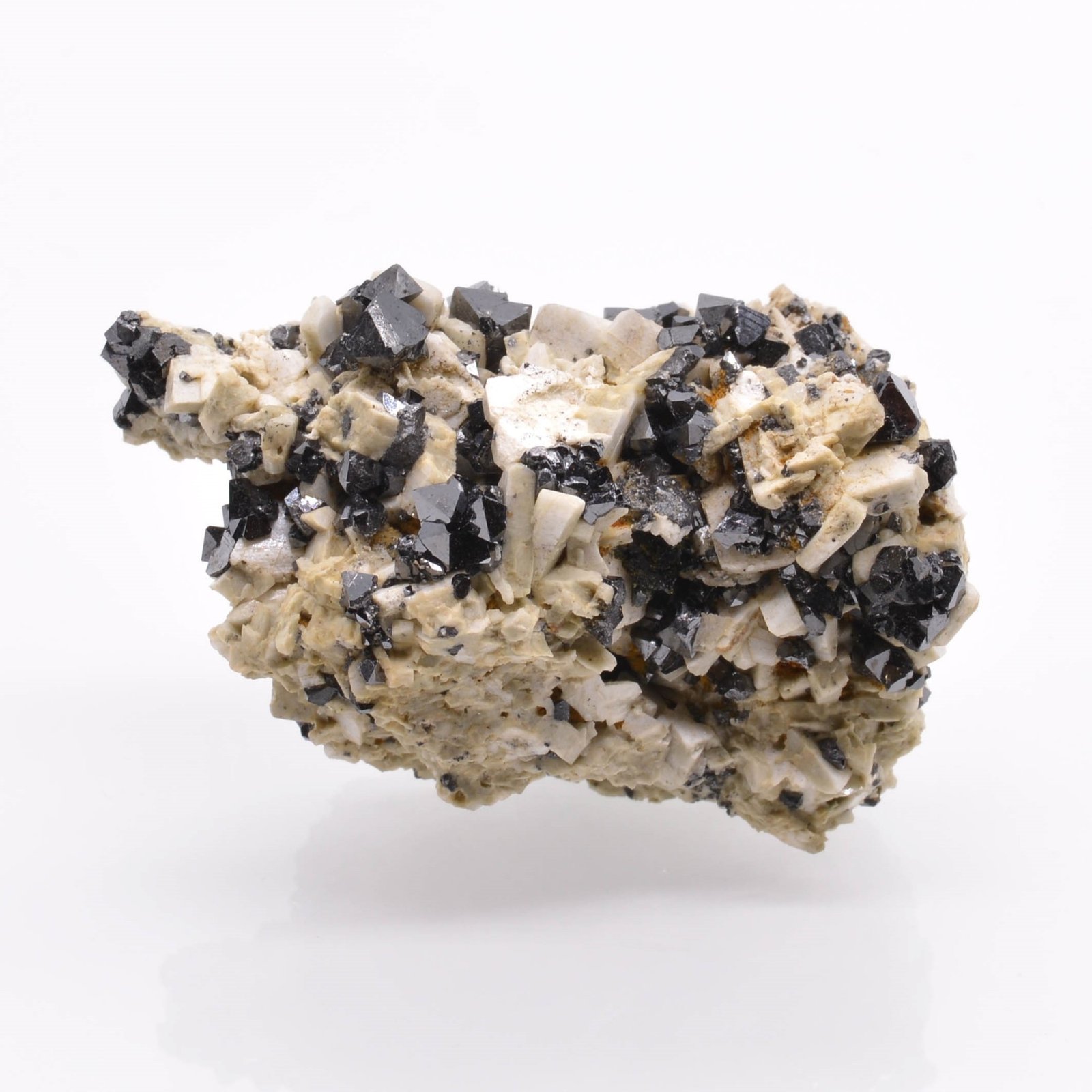 Nombreux petits cristaux de magnétite d'une très belle brillance, contrastant avec l'orthose beige sous-jacente.