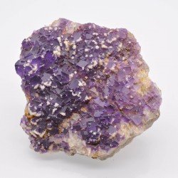 Fluorine de couleur lilas à cristallisation complexe à priori en cubes tronqués, les faces triangulaires présentant une particularité : les sommets sont reliés entre eux par une étoile à trois pointes "Mercedes" composée de microcristaux de fluorine. Pièce issue d'une découverte en 2006 à Tounfit.