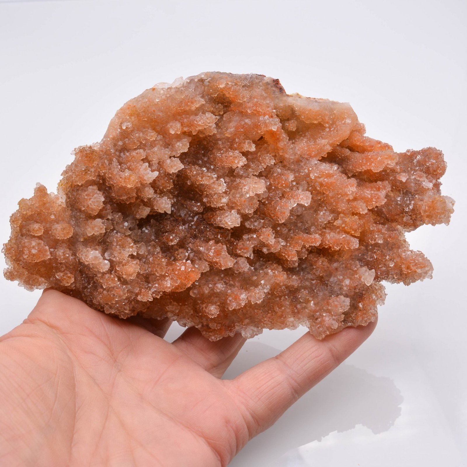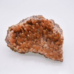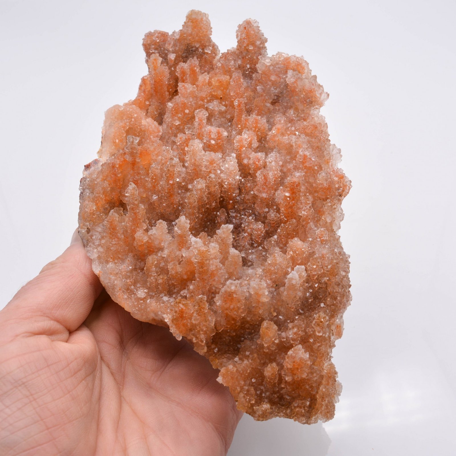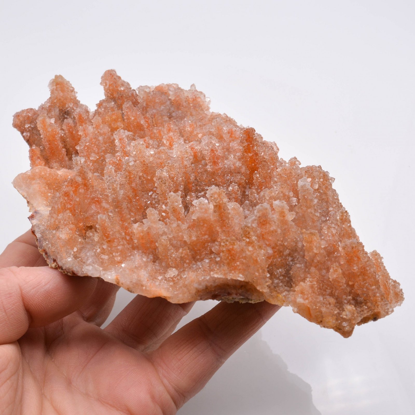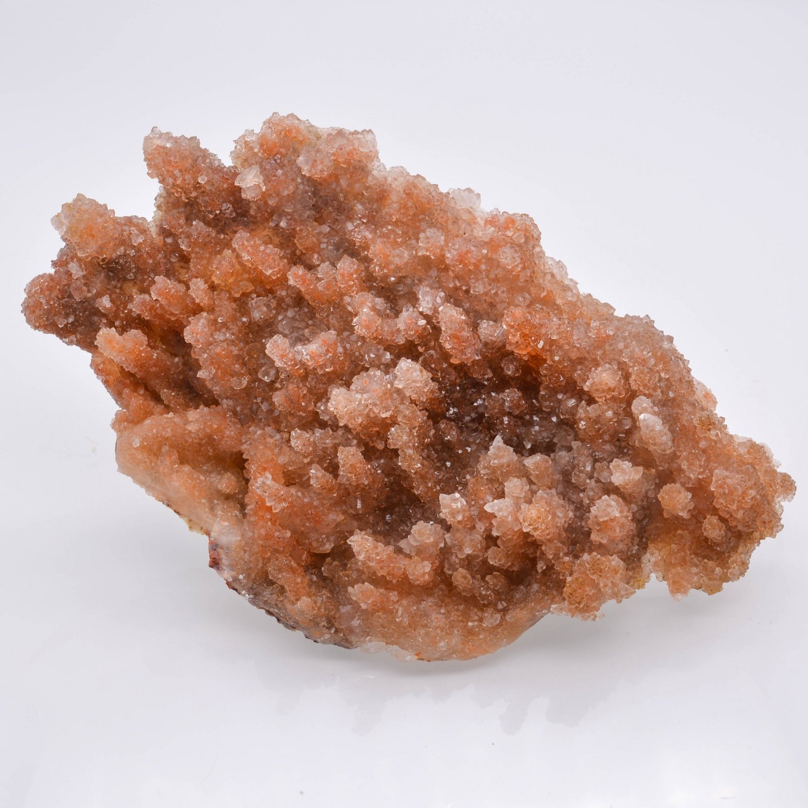 Plaque de petits quartz très brillants cristallisés sur des stalactites de calcédoine orange.