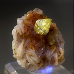 Cérusite brillante, translucide, sur barytine crêtée rose / orangée, accompagnée de petits cubes de galène. La cérusite est d'une belle couleur jaune sous Uvs longs. Un classique marocain très esthétique et de belle qualité !