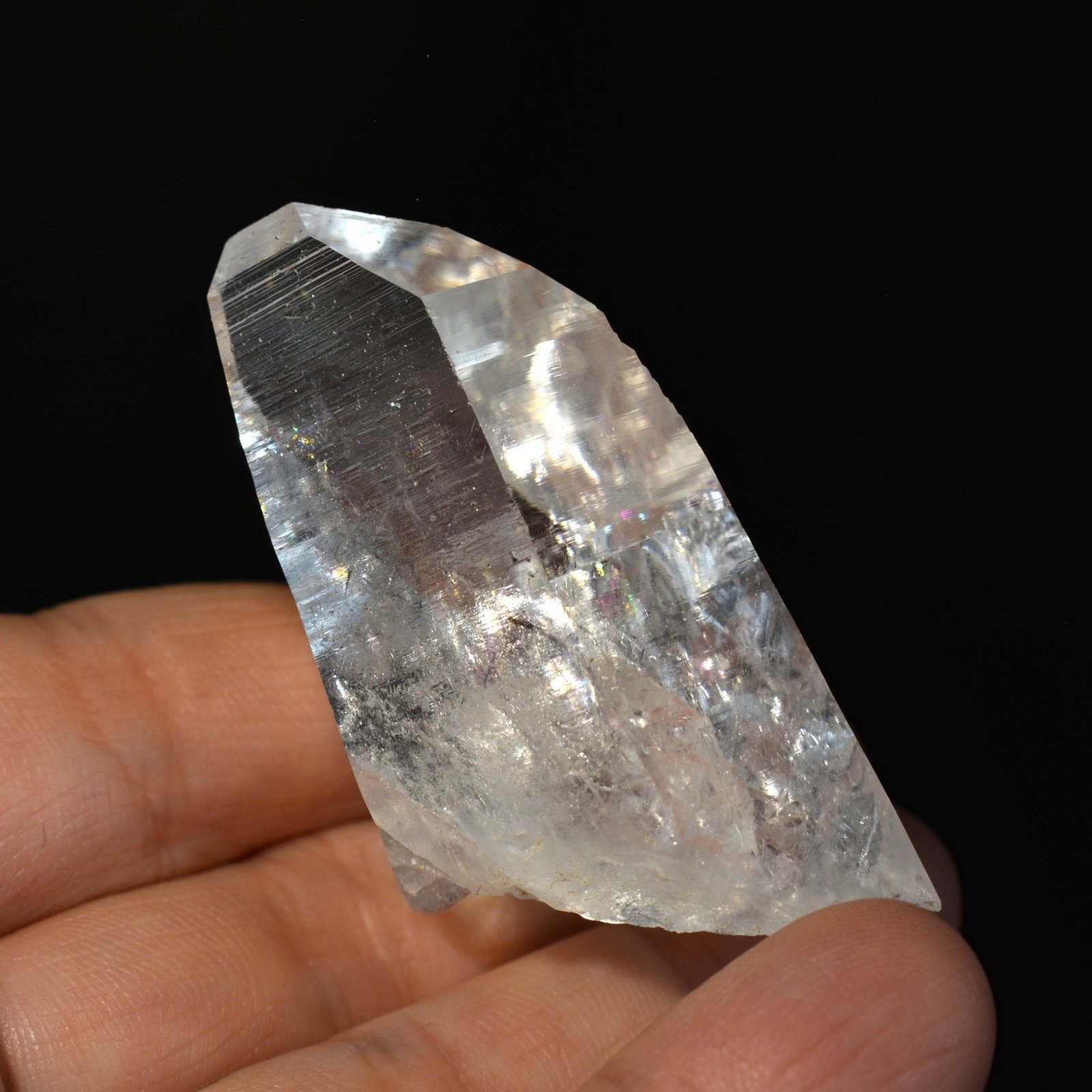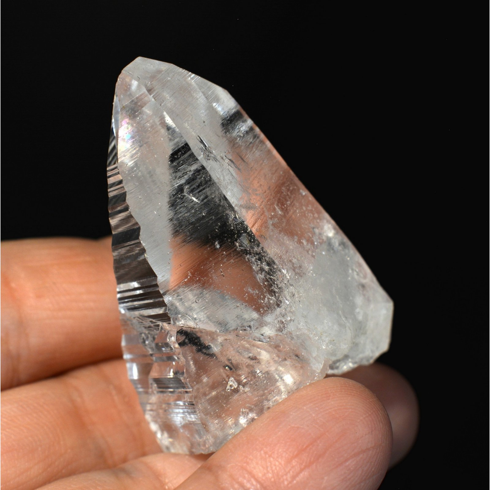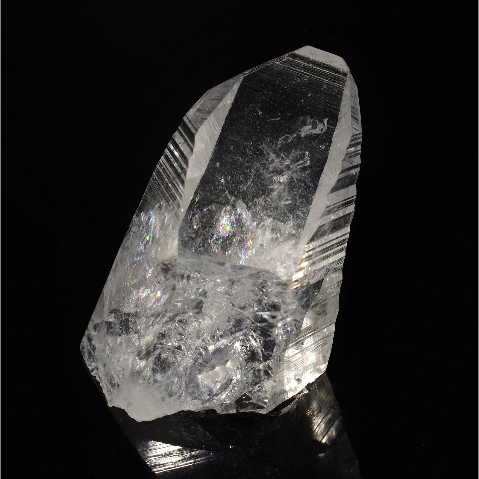 Pointe de quartz incolore, bien translucide, brillante et intacte, montrant de belles stries de croissance.