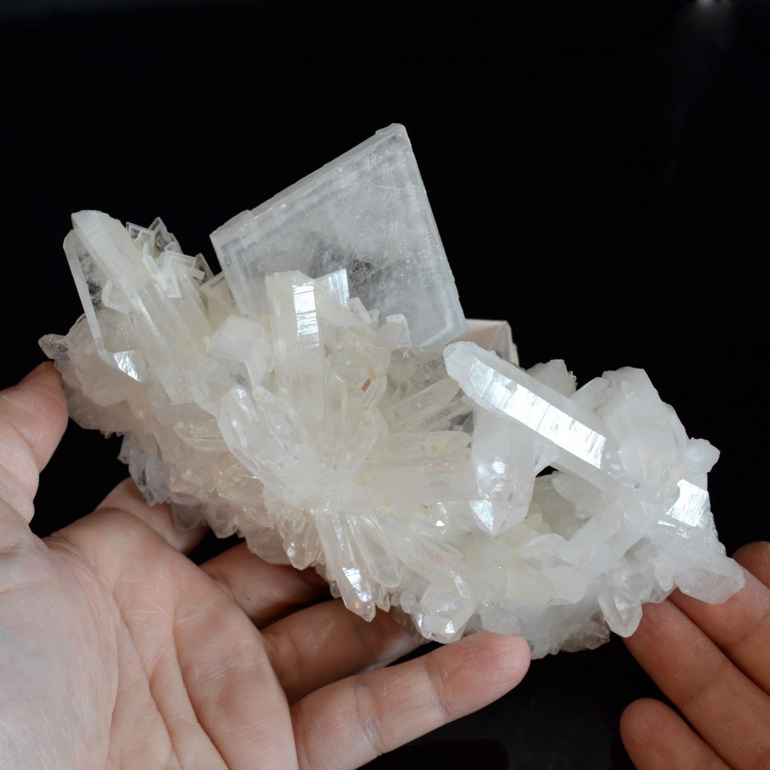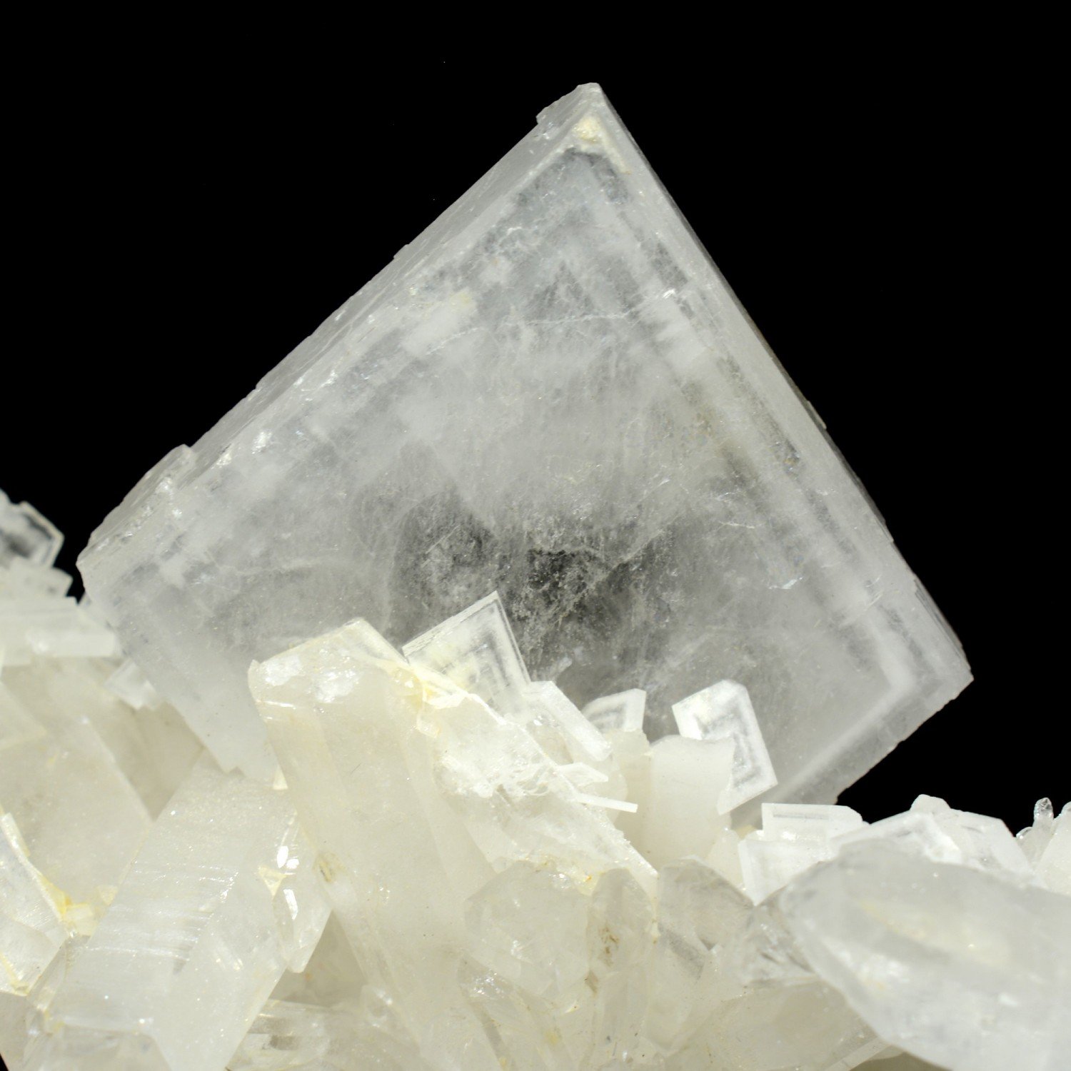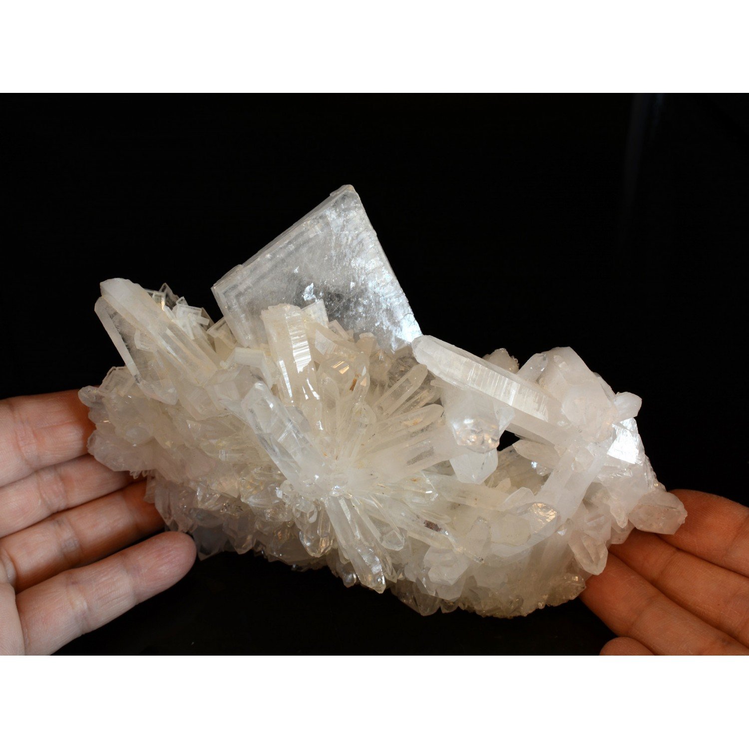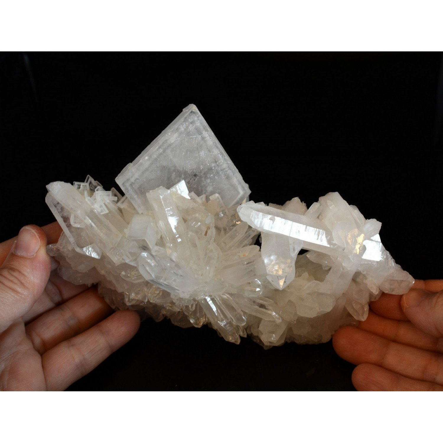 Groupe de quartz hyalin bien brillants et en parfait état accompagnés d'un épais cristal de barytine (1 cm). Un léger frottement sur le haut de la barytine ne nous permet de considérer cette pièce comme parfaite mais elle reste tout de même d'un très bon niveau.