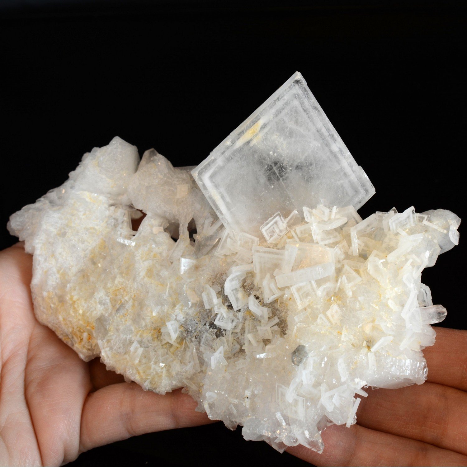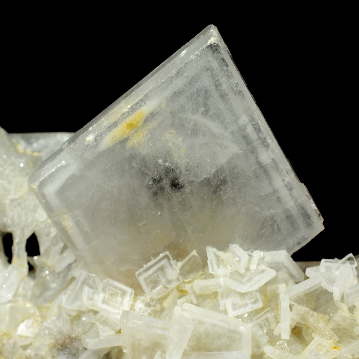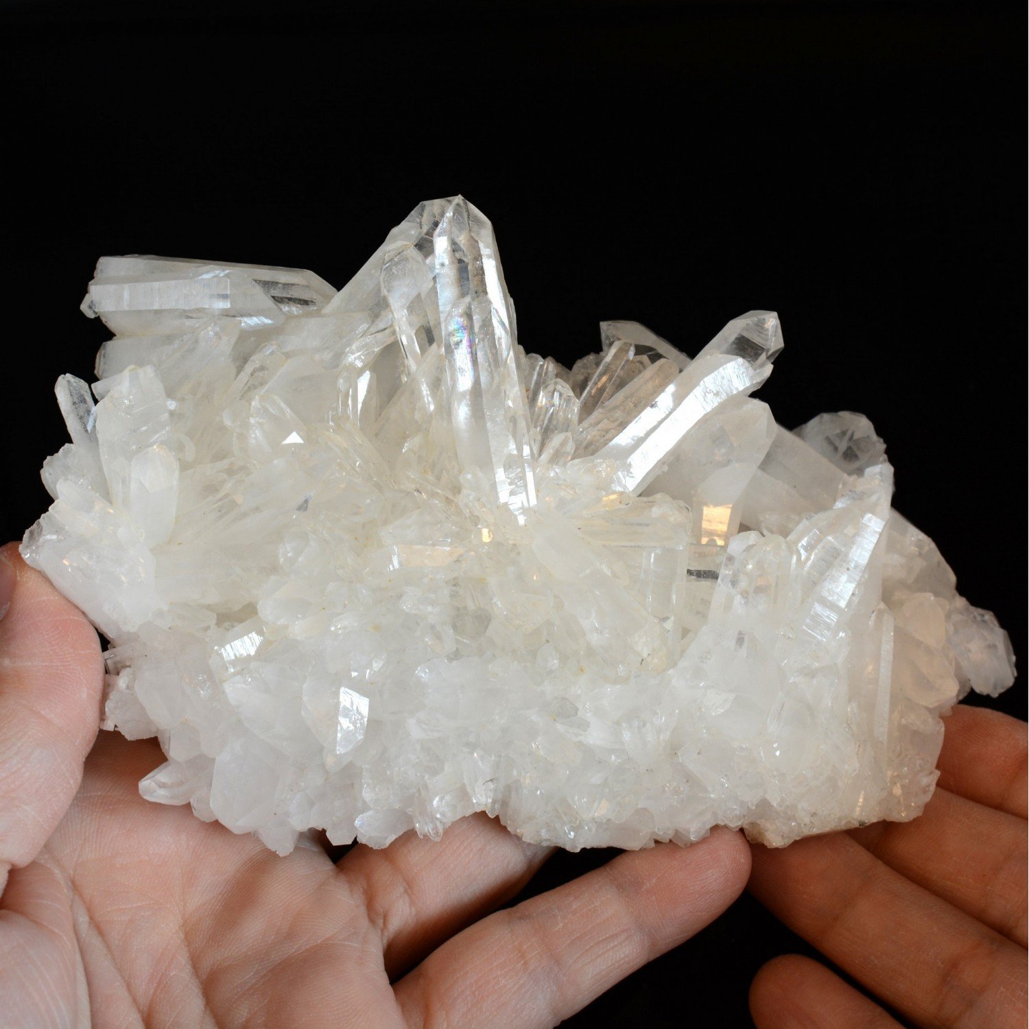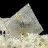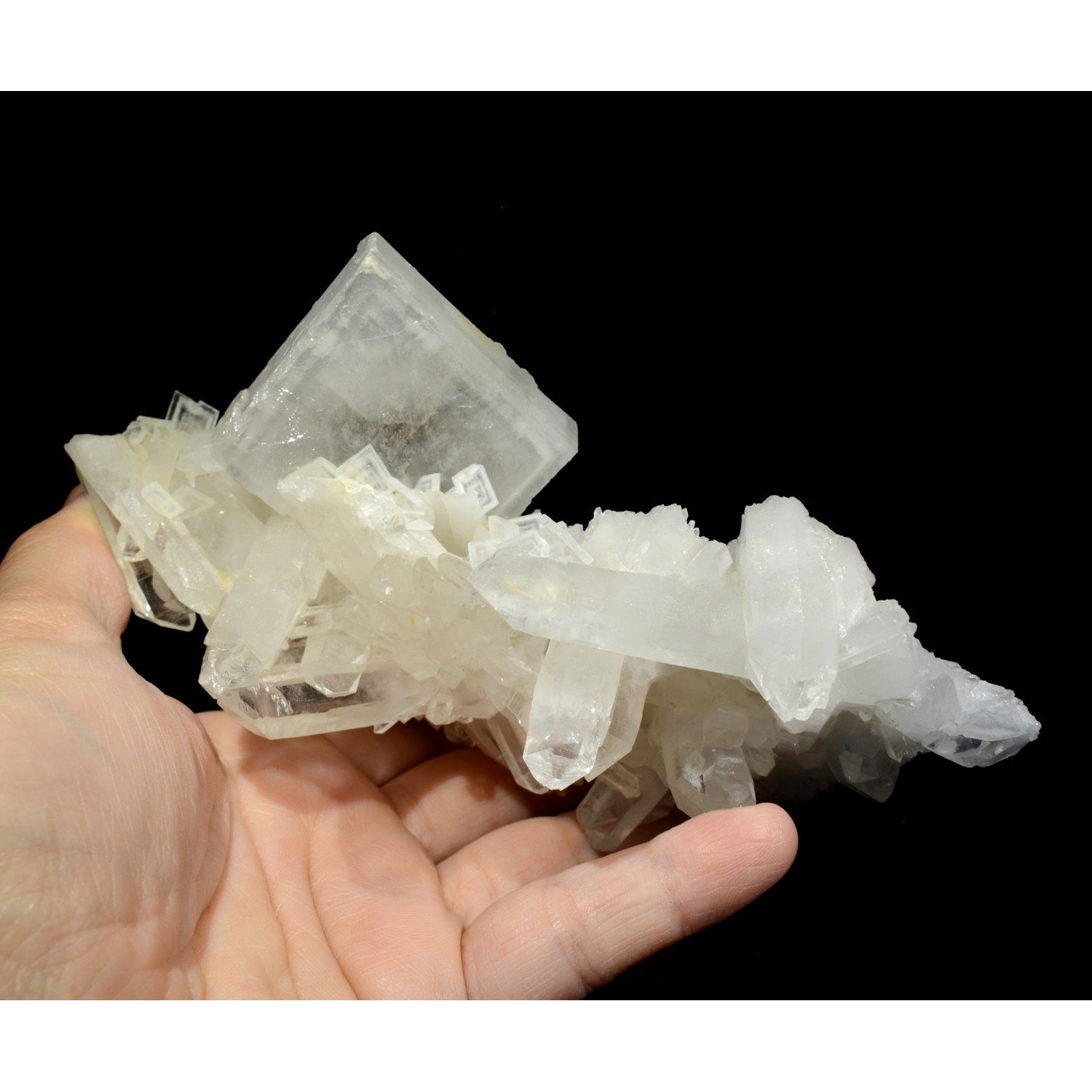 Groupe de quartz hyalin bien brillants et en parfait état accompagnés d'un épais cristal de barytine (1 cm). Un léger frottement sur le haut de la barytine ne nous permet de considérer cette pièce comme parfaite mais elle reste tout de même d'un très bon niveau.