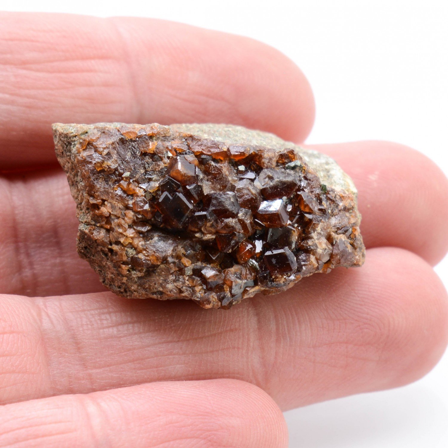 Cristaux de grenats variété hessonite bien cristallisés et brillants provenant des rodingites de la région de Nonza en Haute-Corse.