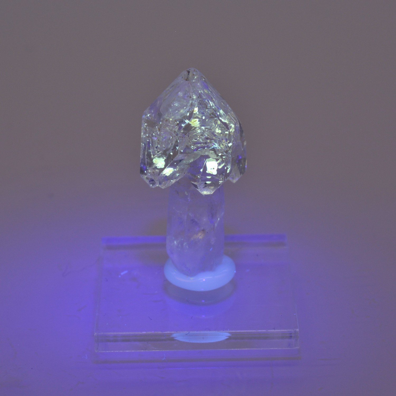 Nouveauté de 2023 : des quartz de Madagascar à inclusions d'hydrocarbures, notamment de pétrole, très fluorescent aux Uvs. Le quartz sceptré présenté ici est d'une belle brillance.
