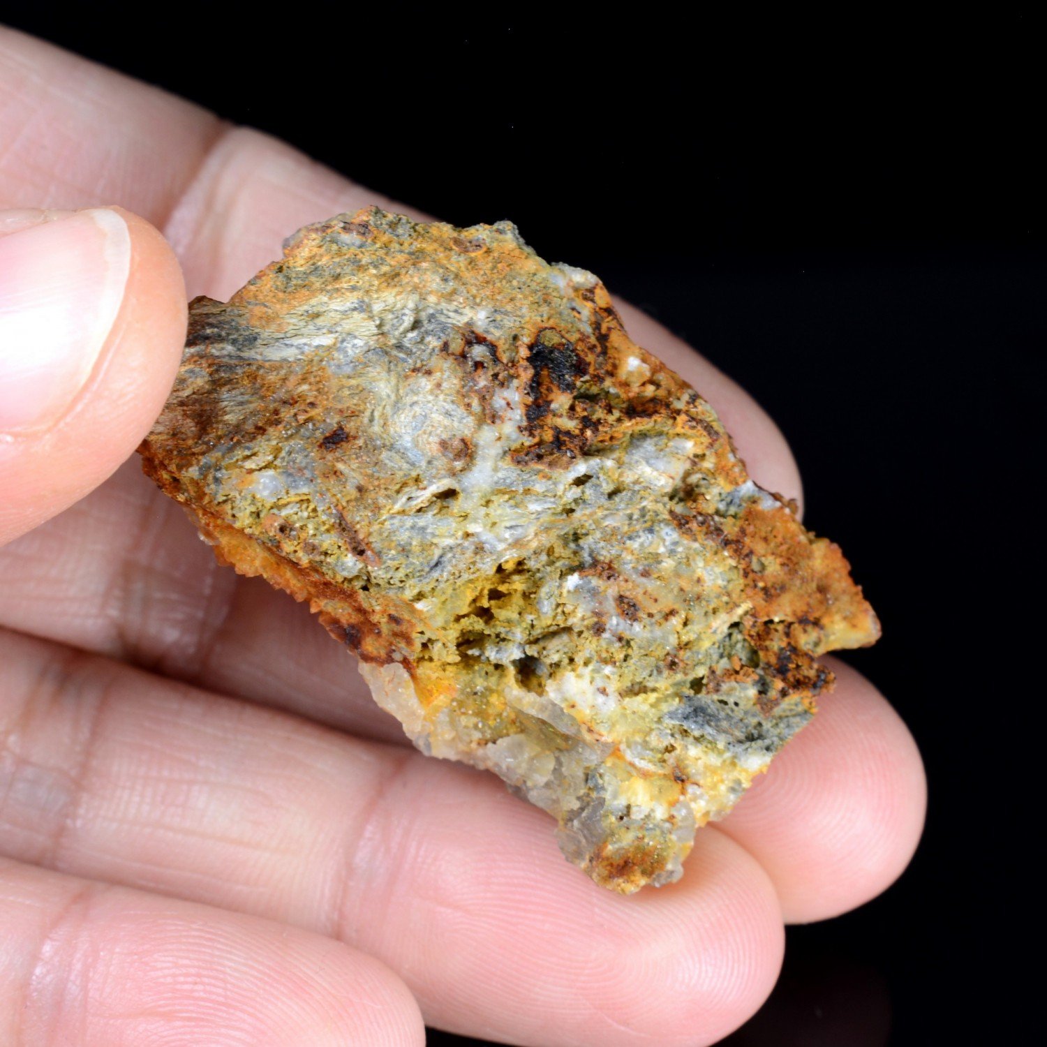 Fluorine bleue partiellement recouverte de quartz naturellement colorés par des oxydes de fer, offrant un esthétique contraste !