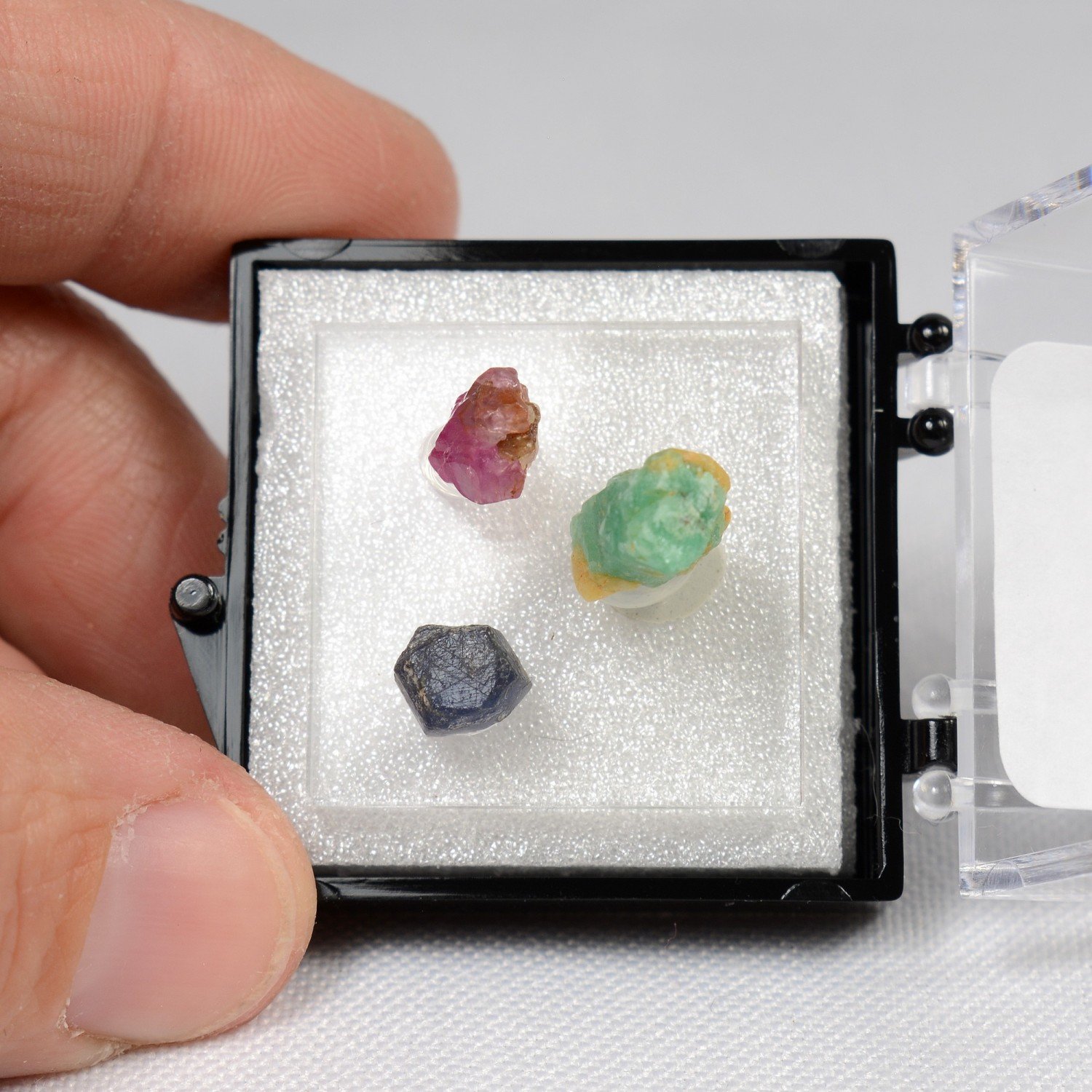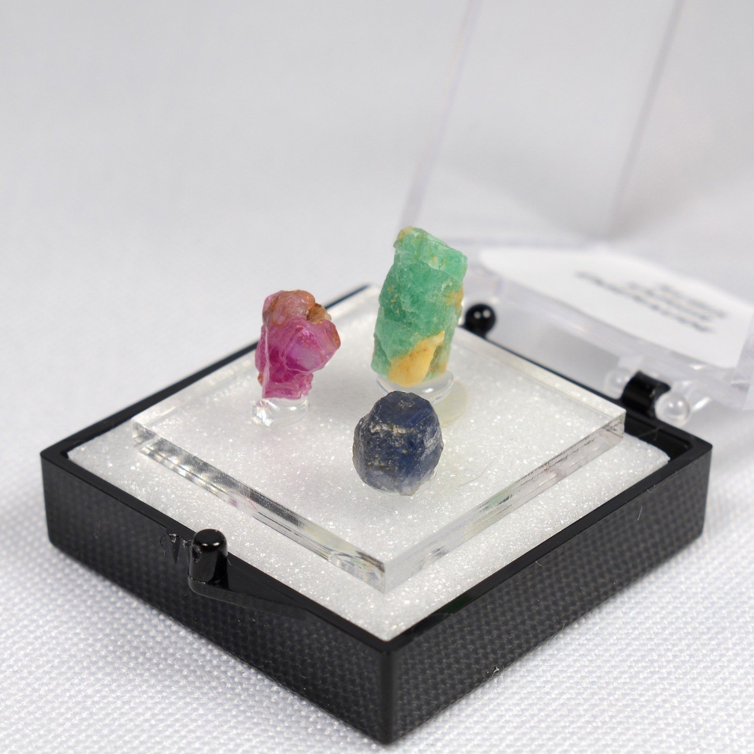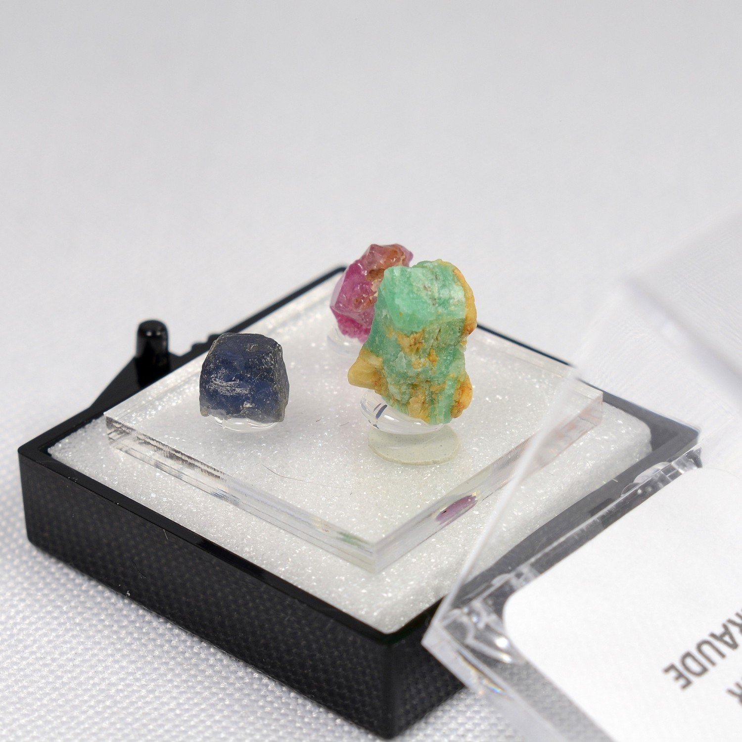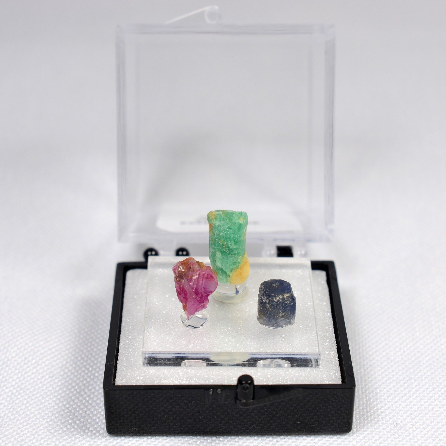 TRIO de véritables cristaux d'émeraude, saphir et rubis cristallisés (non gemmes).